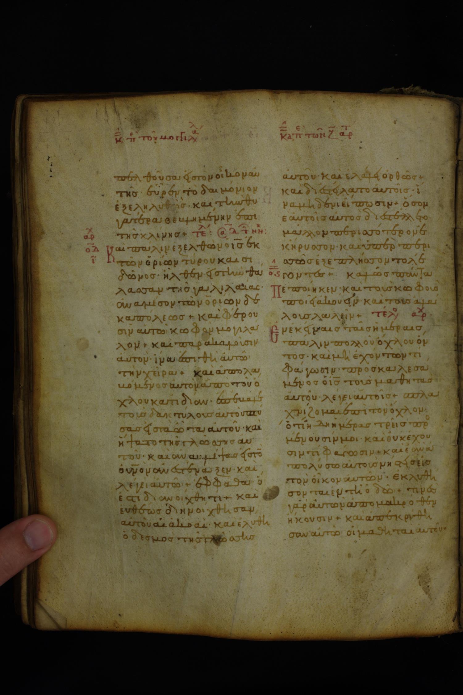Twelfth century minuscule of the Gospels on parchment; 185 leaves, 2 columns, 26–30 lines per column.