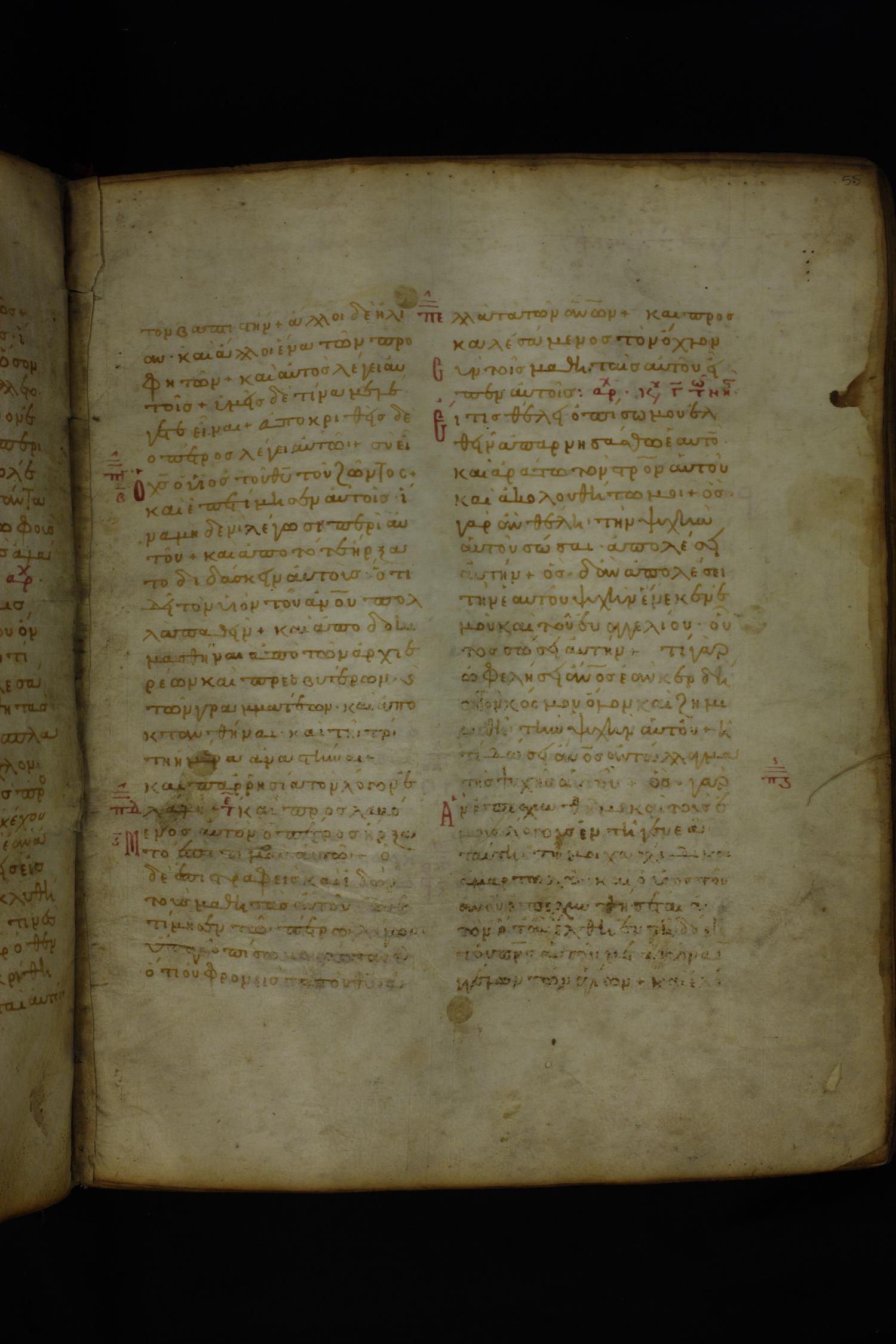 Twelfth century minuscule of the Gospels on parchment; 185 leaves, 2 columns, 26–30 lines per column.