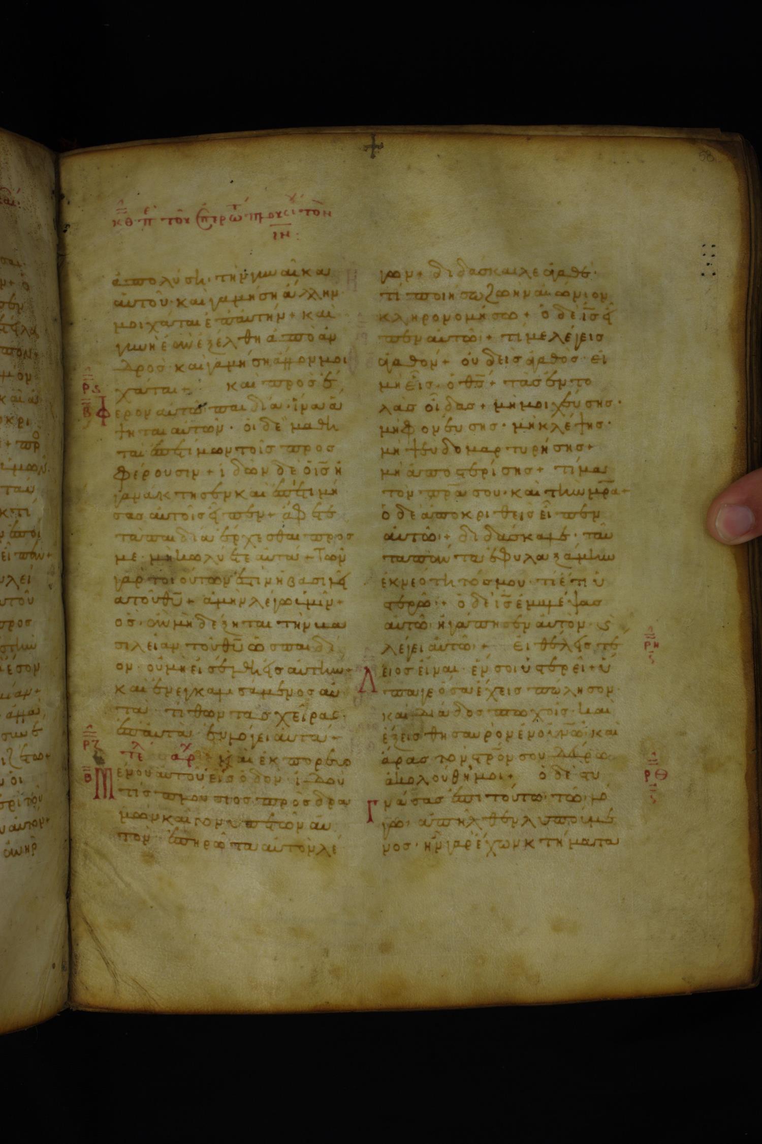 Twelfth century minuscule of the Gospels on parchment; 185 leaves, 2 columns, 26–30 lines per column.