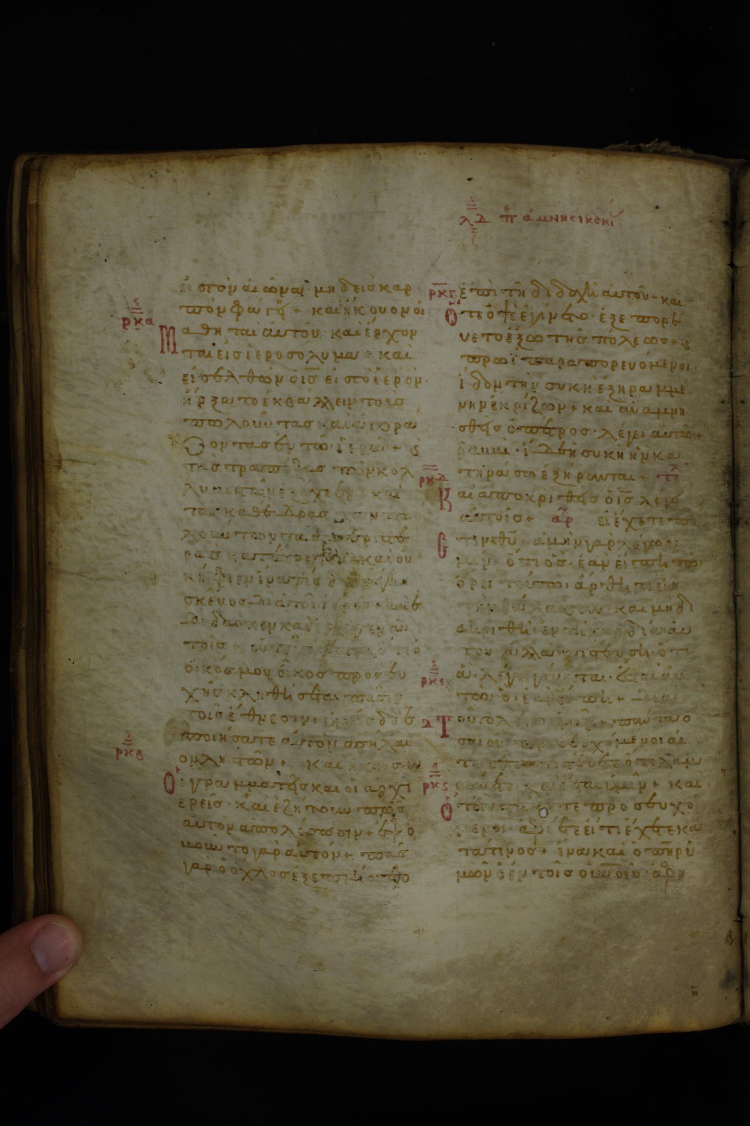 Twelfth century minuscule of the Gospels on parchment; 185 leaves, 2 columns, 26–30 lines per column.