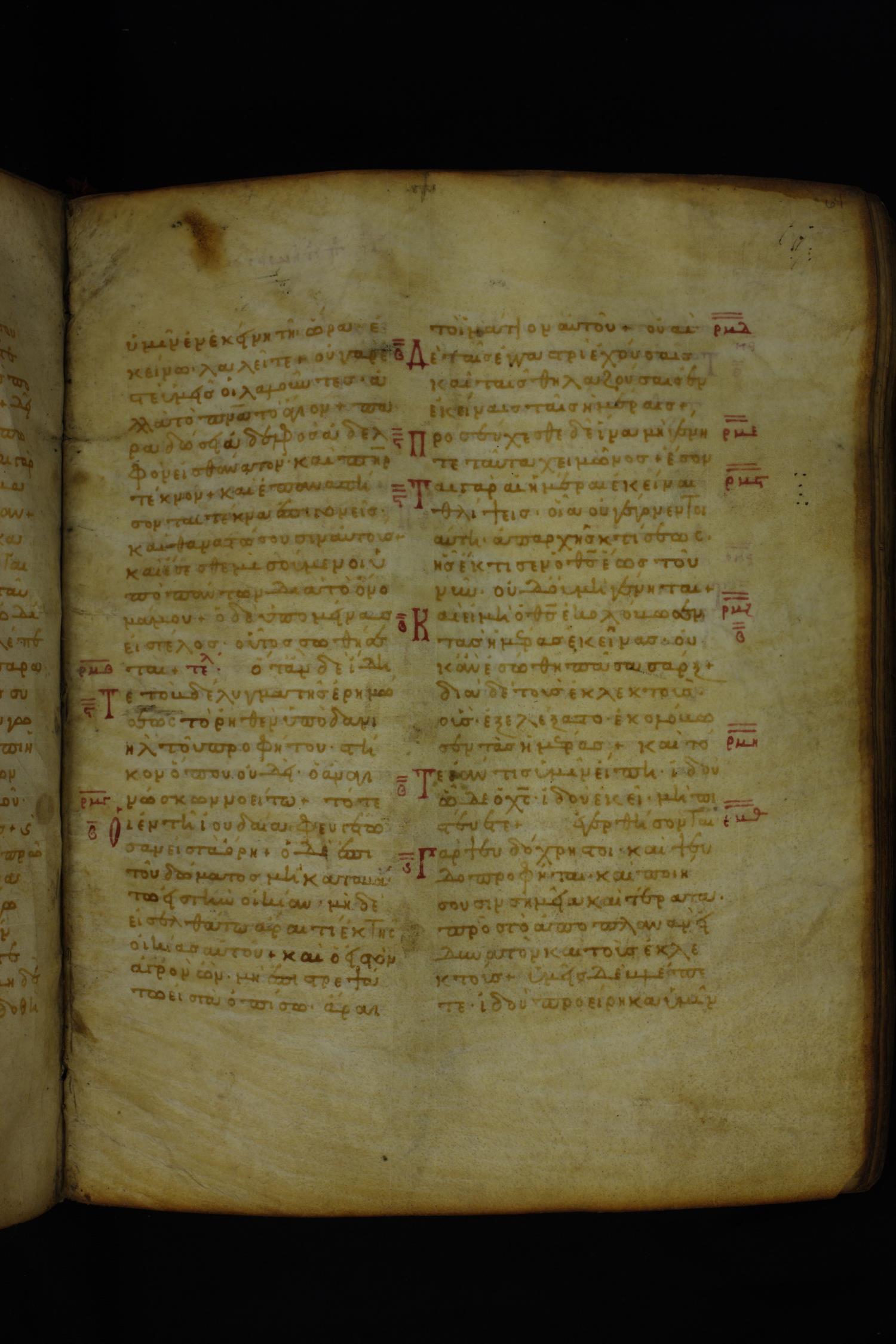Twelfth century minuscule of the Gospels on parchment; 185 leaves, 2 columns, 26–30 lines per column.