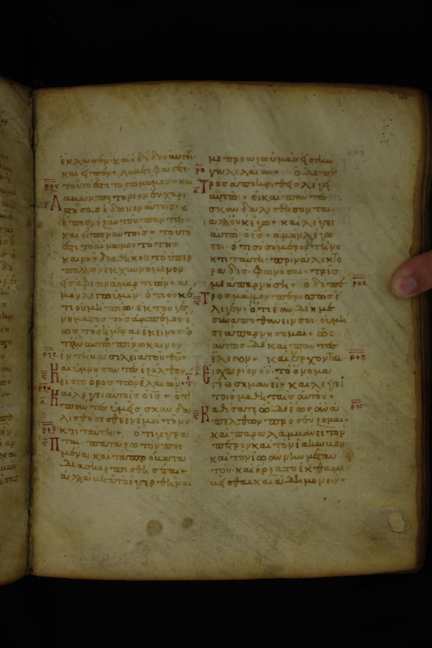 Twelfth century minuscule of the Gospels on parchment; 185 leaves, 2 columns, 26–30 lines per column.