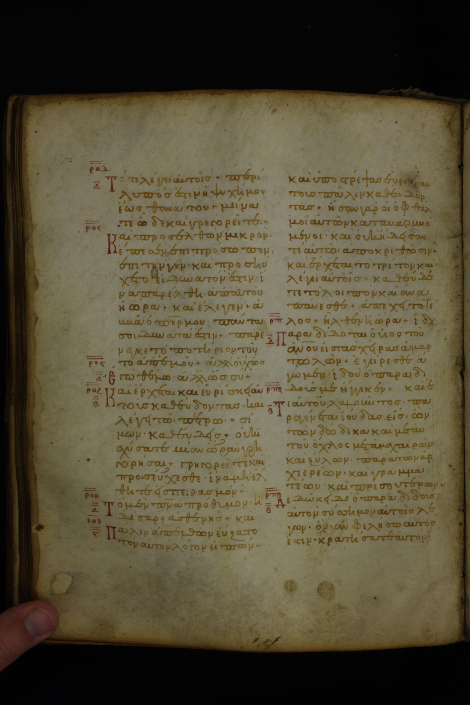 Twelfth century minuscule of the Gospels on parchment; 185 leaves, 2 columns, 26–30 lines per column.