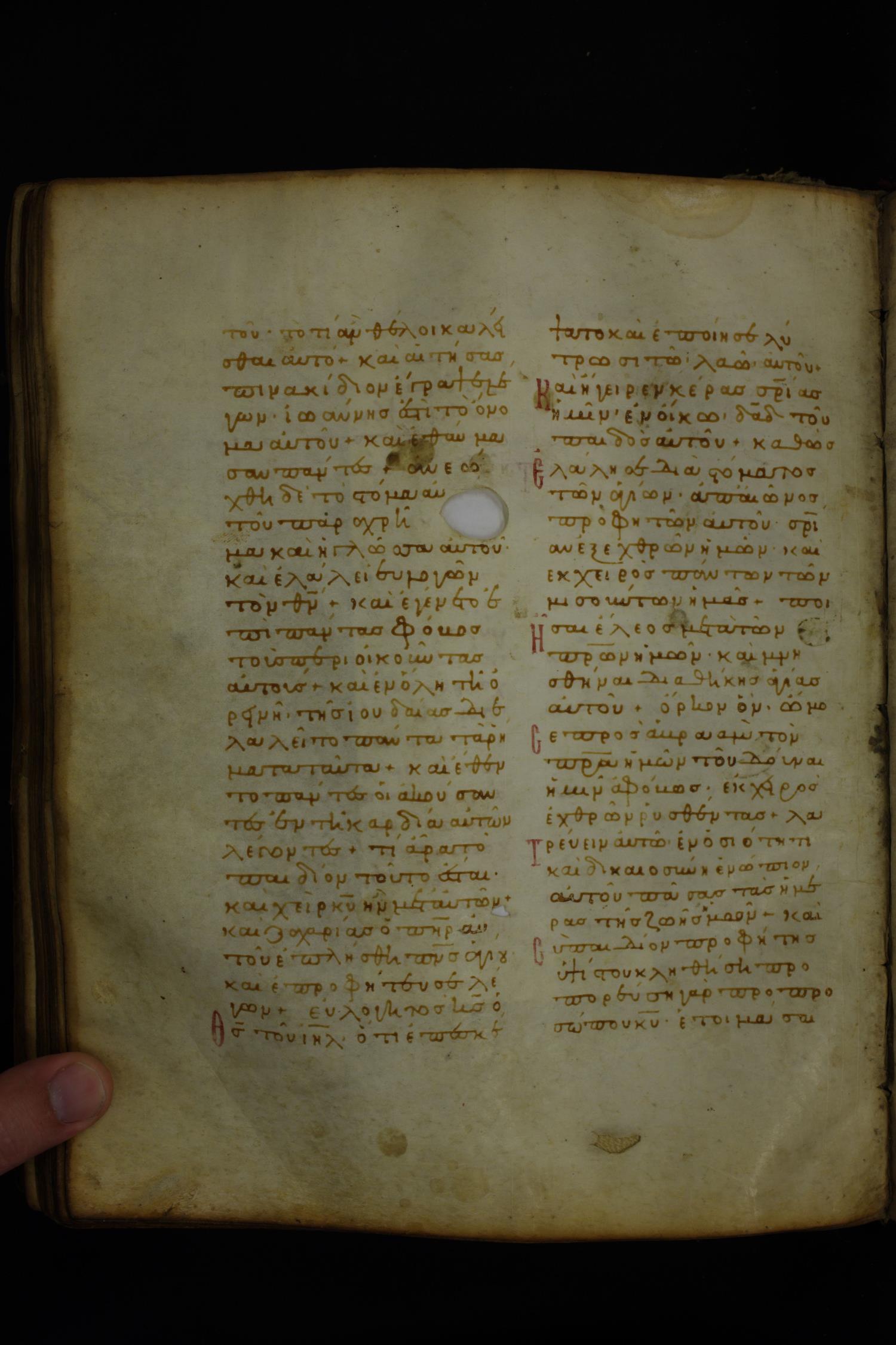 Twelfth century minuscule of the Gospels on parchment; 185 leaves, 2 columns, 26–30 lines per column.