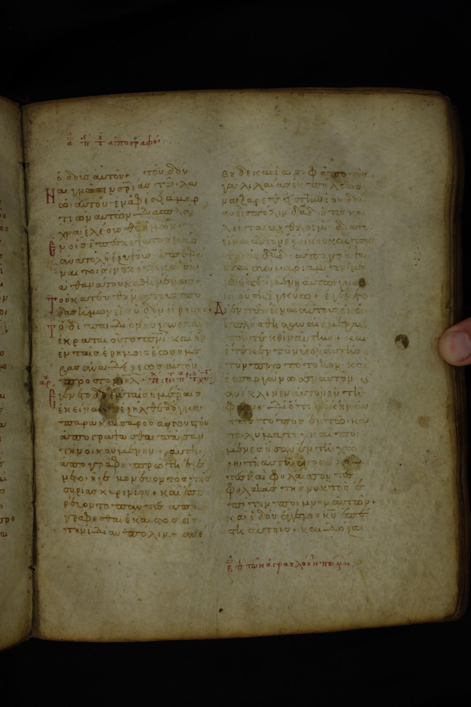 Twelfth century minuscule of the Gospels on parchment; 185 leaves, 2 columns, 26–30 lines per column.