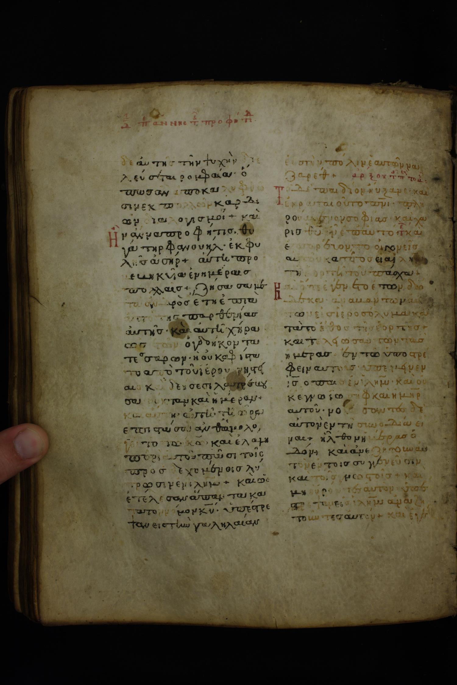 Twelfth century minuscule of the Gospels on parchment; 185 leaves, 2 columns, 26–30 lines per column.