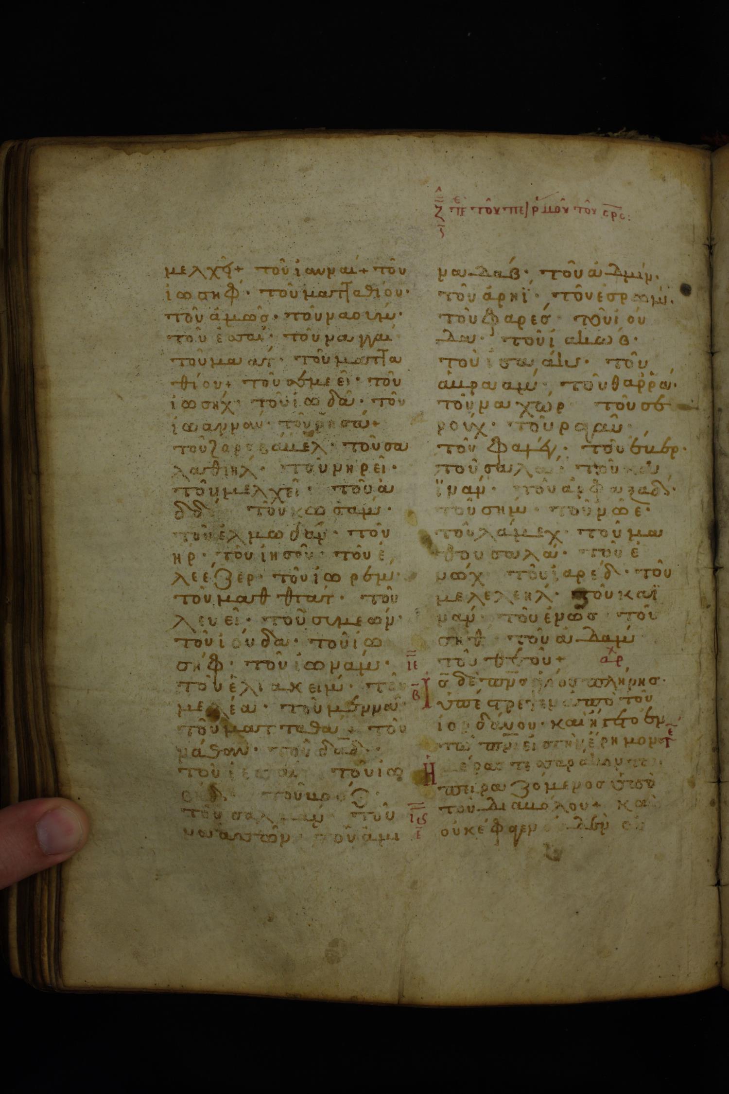 Twelfth century minuscule of the Gospels on parchment; 185 leaves, 2 columns, 26–30 lines per column.