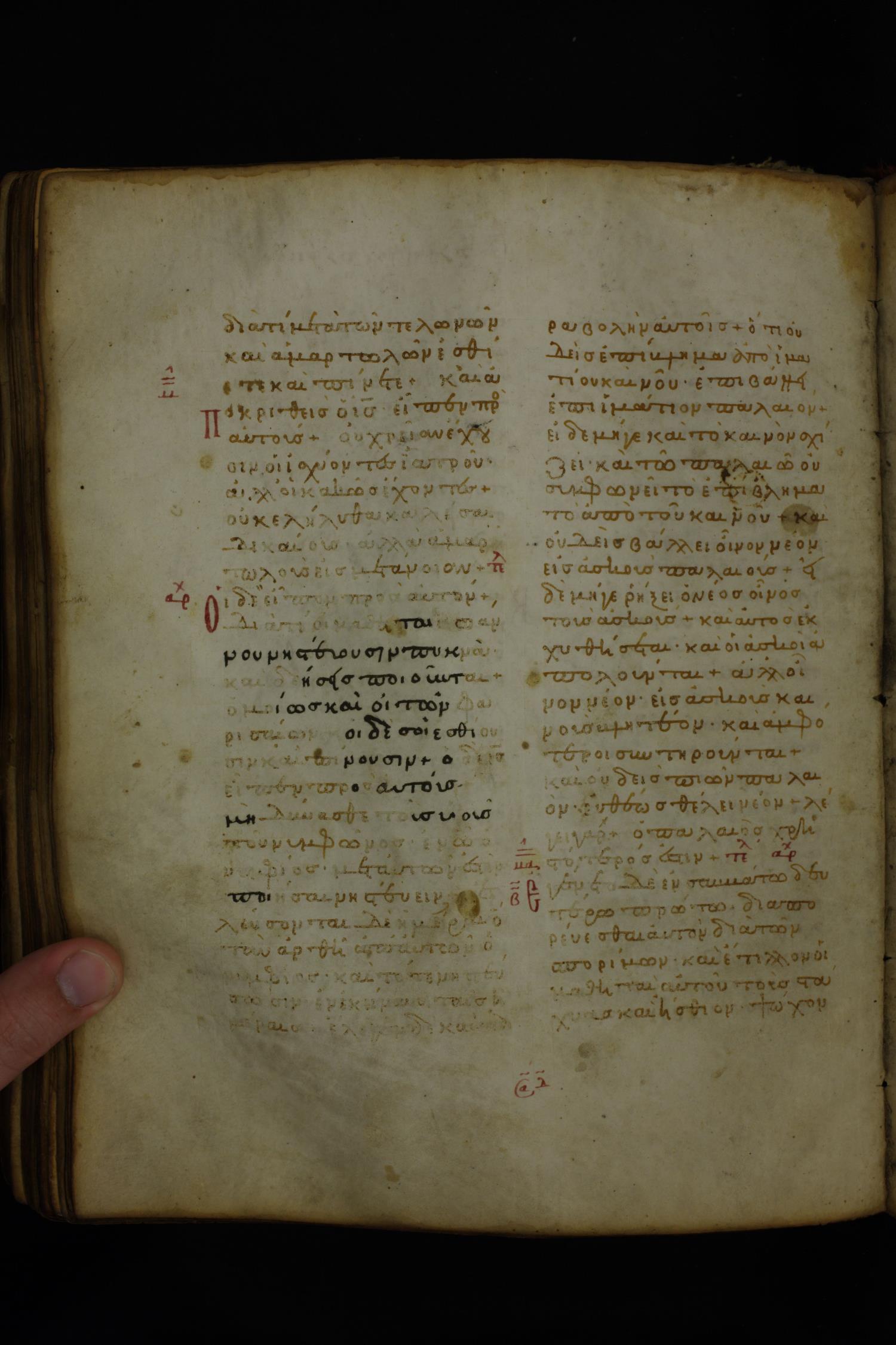 Twelfth century minuscule of the Gospels on parchment; 185 leaves, 2 columns, 26–30 lines per column.