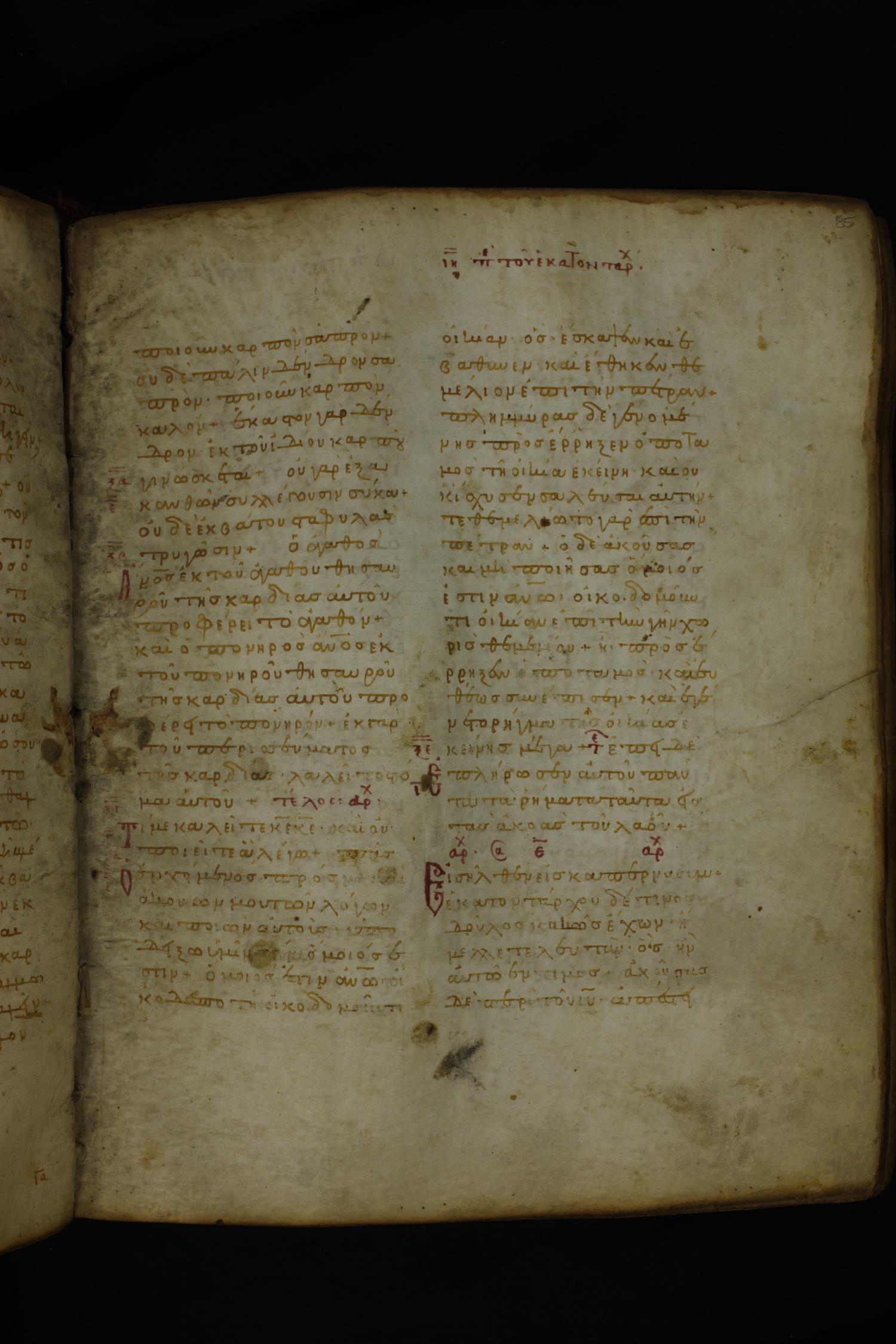 Twelfth century minuscule of the Gospels on parchment; 185 leaves, 2 columns, 26–30 lines per column.