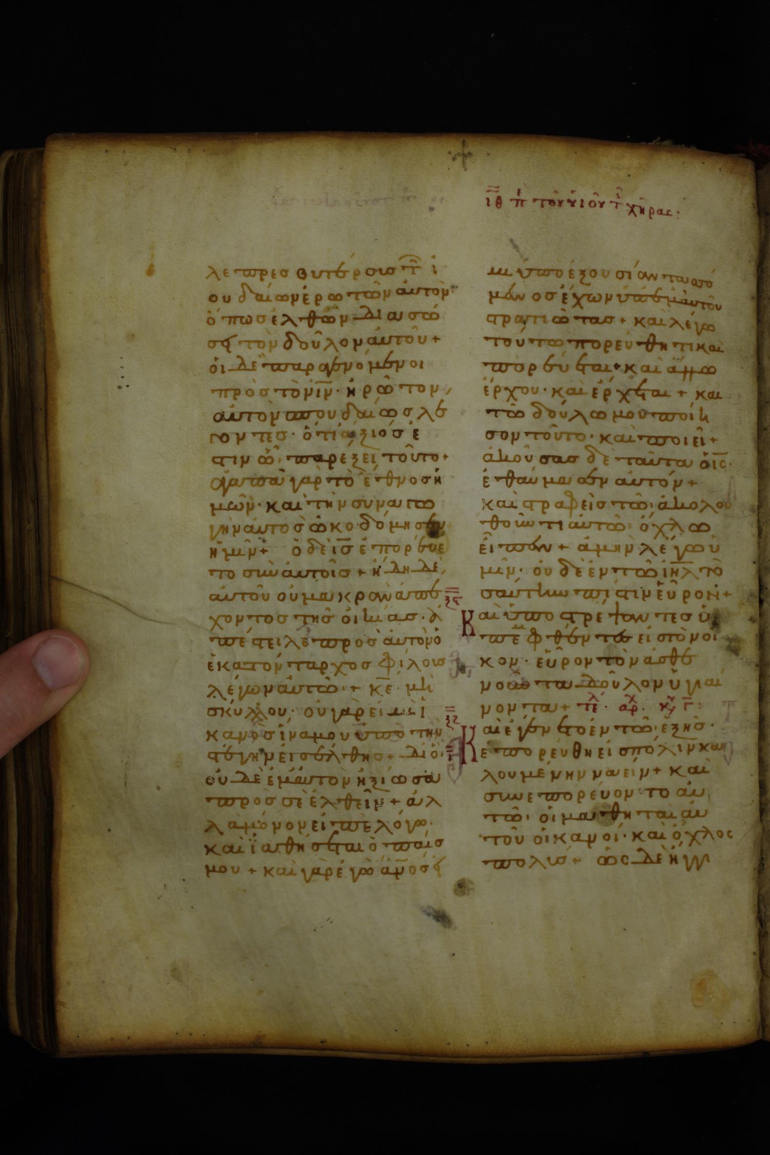 Twelfth century minuscule of the Gospels on parchment; 185 leaves, 2 columns, 26–30 lines per column.