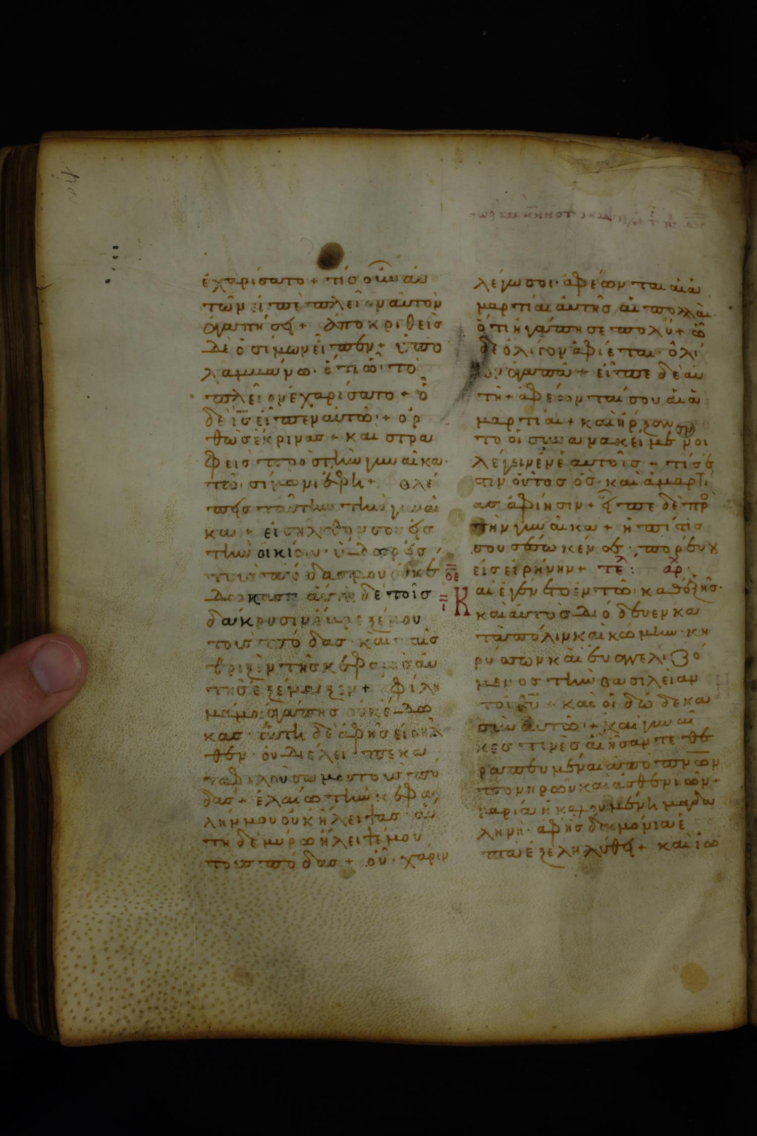 Twelfth century minuscule of the Gospels on parchment; 185 leaves, 2 columns, 26–30 lines per column.