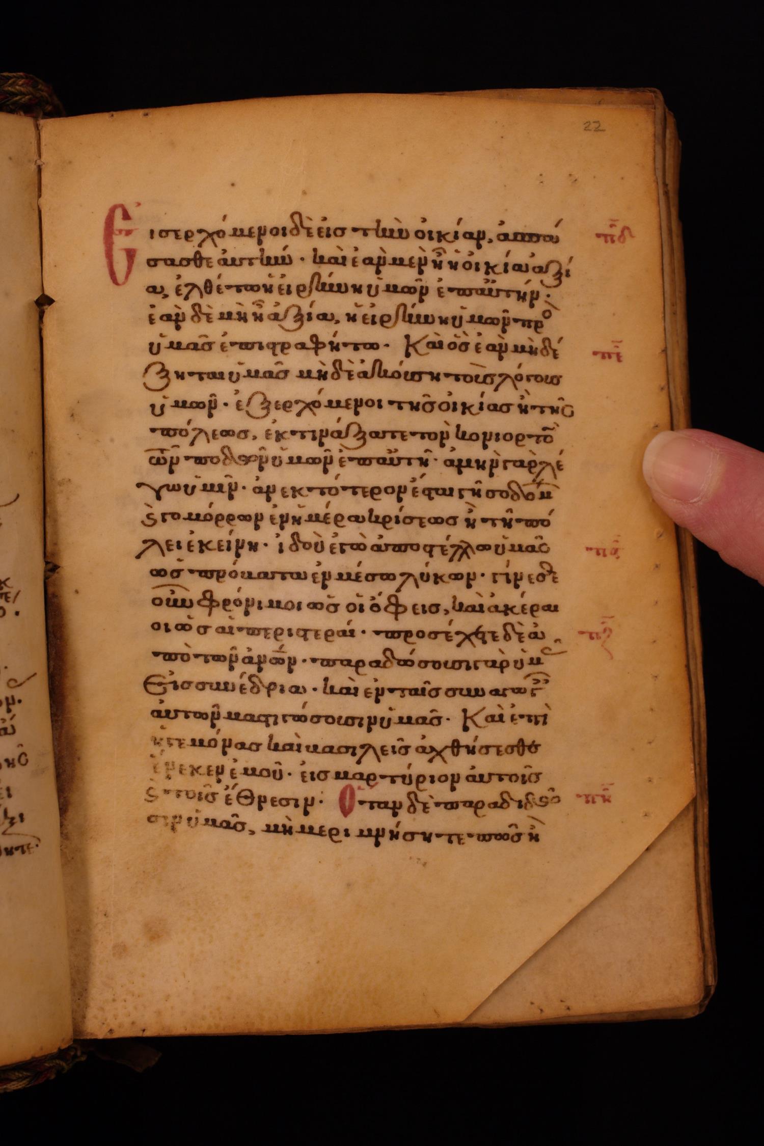 Thirteenth century minuscule of the Gospels on parchment; 256 leaves, single column, 22 lines per column.