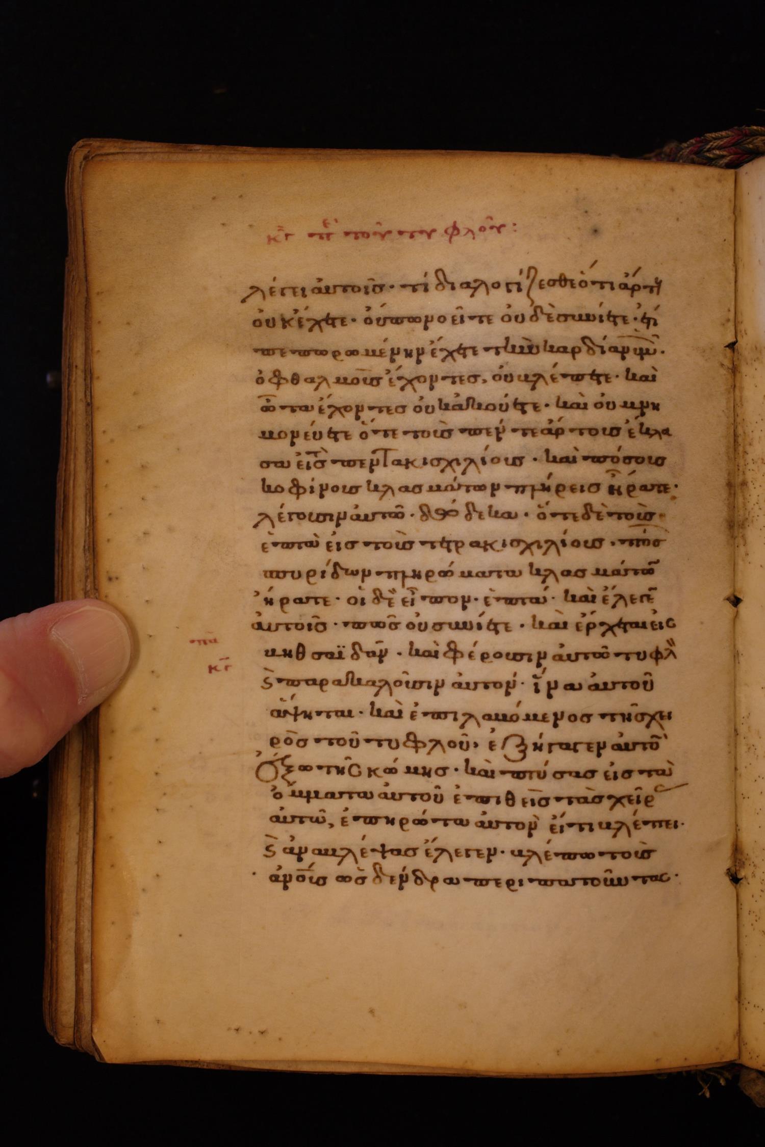 καὶ ἐπιλαβόμενος τῆς χειρὸς τοῦ τυφλοῦ ἐξήνεγκεν αὐτὸν ἔξω τῆς κώμης, καὶ πτύσας εἰς τὰ ὄμματα αὐτοῦ, ἐπιθεὶς τὰς χεῖρας αὐτῷ, ἐπηρώτα αὐτόν Εἴ τι βλέπεις;