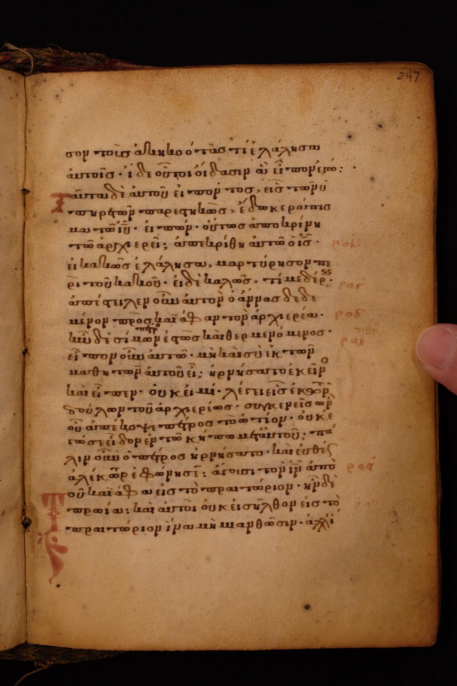 Thirteenth century minuscule of the Gospels on parchment; 256 leaves, single column, 22 lines per column.