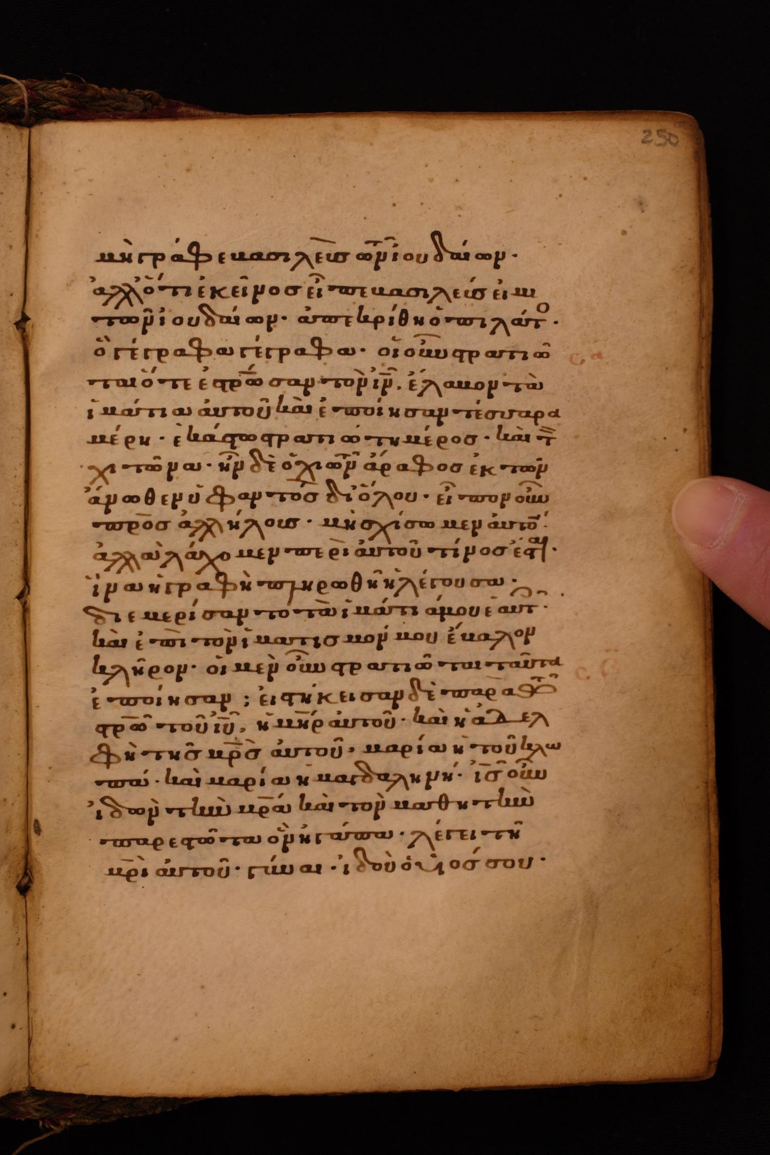Thirteenth century minuscule of the Gospels on parchment; 256 leaves, single column, 22 lines per column.