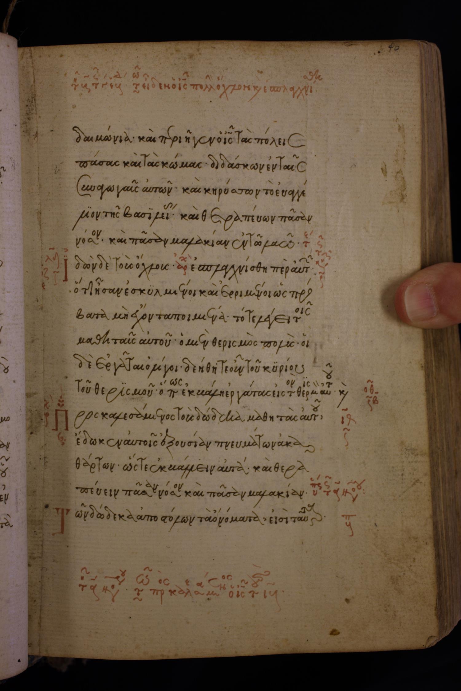 Καὶ περιῆγεν ὁ Ἰησοῦς τὰς πόλεις πάσας καὶ τὰς κώμας, διδάσκων ἐν ταῖς συναγωγαῖς αὐτῶν καὶ κηρύσσων τὸ εὐαγγέλιον τῆς βασιλείας καὶ θεραπεύων πᾶσαν νόσον καὶ πᾶσαν μαλακίαν.