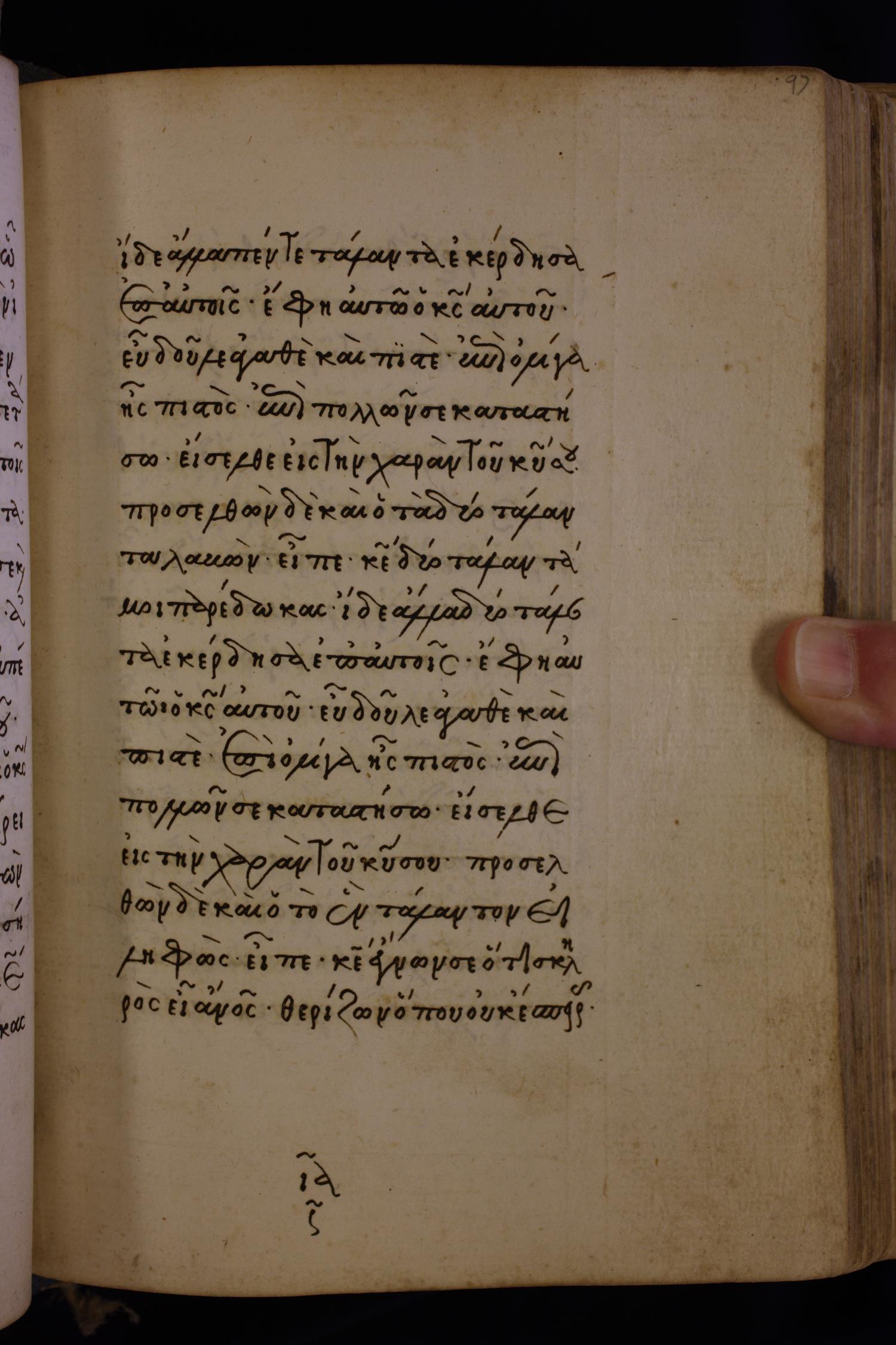 ἔφη αὐτῷ ὁ κύριος αὐτοῦ Εὖ, δοῦλε ἀγαθὲ καὶ πιστέ, ἐπὶ ὀλίγα ἦς πιστός, ἐπὶ πολλῶν σε καταστήσω· εἴσελθε εἰς τὴν χαρὰν τοῦ κυρίου σου.