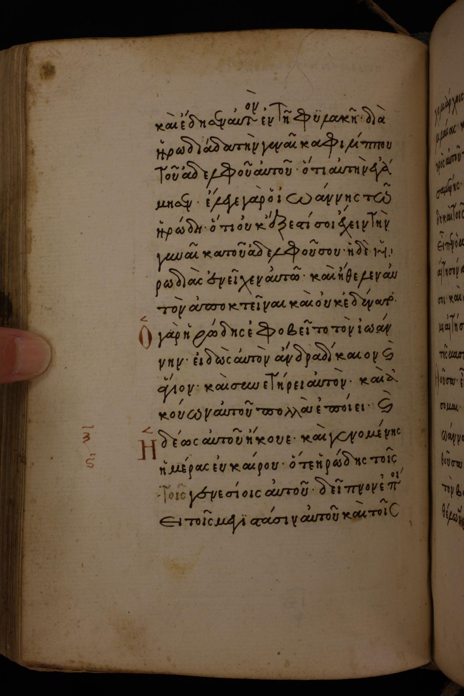 ὁ γὰρ Ἡρῴδης ἐφοβεῖτο τὸν Ἰωάνην / Ἰωάννην, εἰδὼς αὐτὸν ἄνδρα δίκαιον καὶ ἅγιον, καὶ συνετήρει αὐτόν, καὶ ἀκούσας αὐτοῦ πολλὰ ἠπόρει, καὶ ἡδέως αὐτοῦ ἤκουεν.