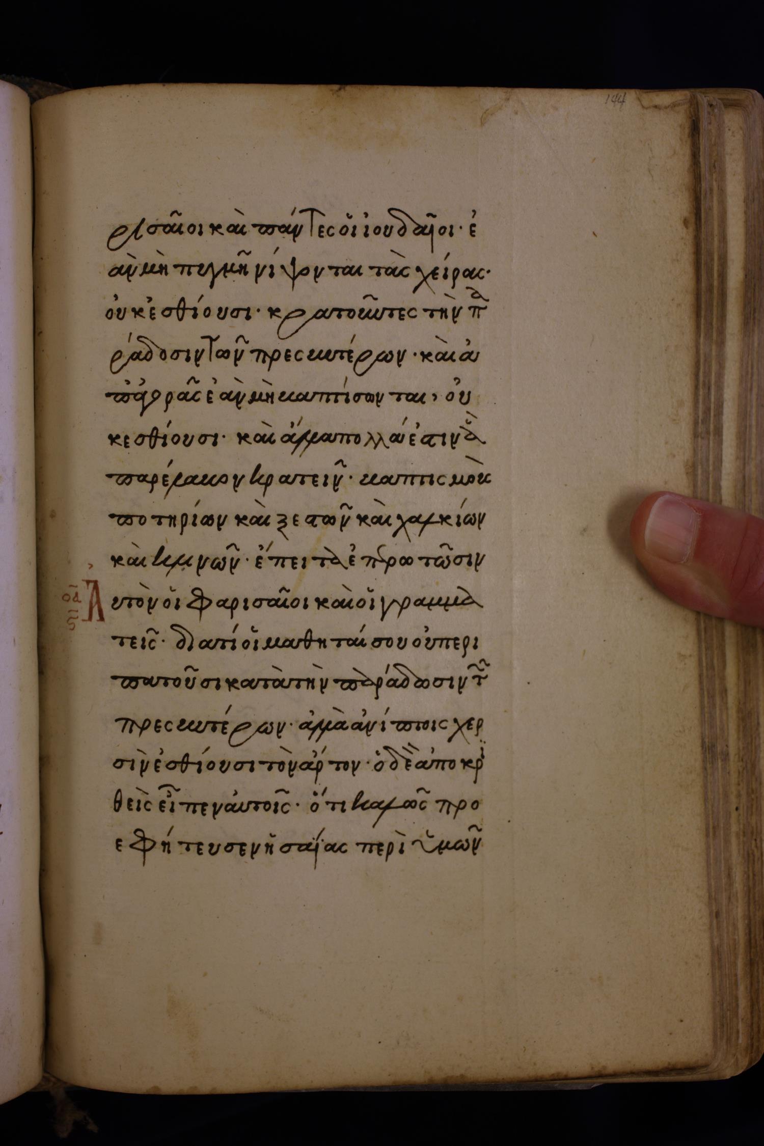 καὶ ἐπερωτῶσιν αὐτὸν οἱ Φαρισαῖοι καὶ οἱ γραμματεῖς Διὰ τί οὐ περιπατοῦσιν οἱ μαθηταί σου κατὰ τὴν παράδοσιν τῶν πρεσβυτέρων, ἀλλὰ κοιναῖς χερσὶν ἐσθίουσιν τὸν ἄρτον;