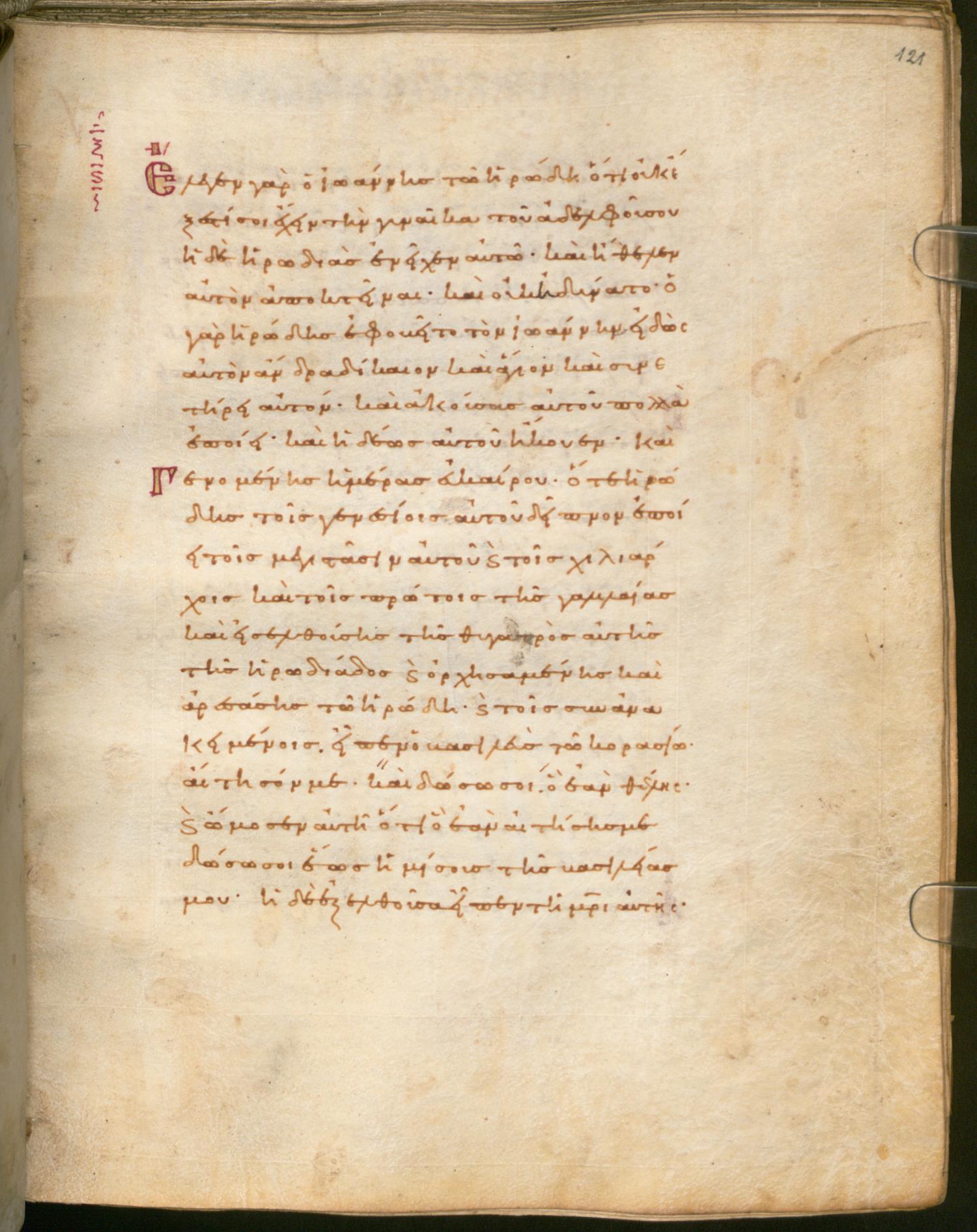 Καὶ γενομένης ἡμέρας εὐκαίρου ὅτε Ἡρῴδης τοῖς γενεσίοις αὐτοῦ δεῖπνον ἐποίησεν τοῖς μεγιστᾶσιν αὐτοῦ καὶ τοῖς χιλιάρχοις καὶ τοῖς πρώτοις τῆς Γαλιλαίας,