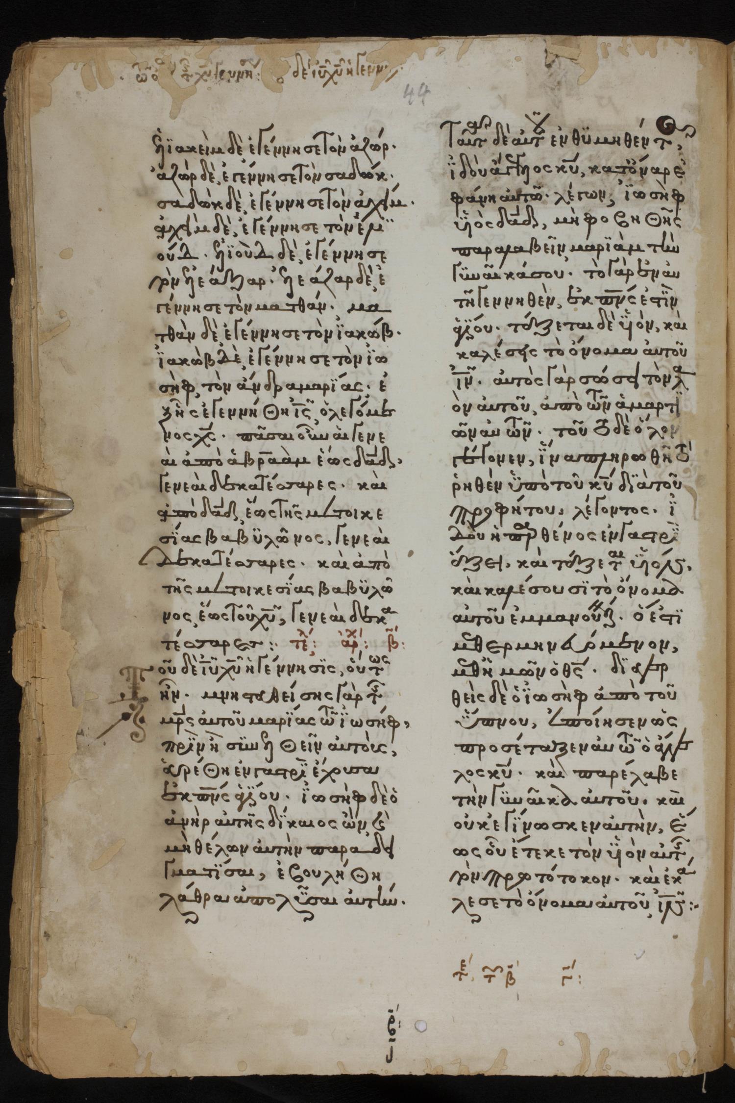Thirteenth century minuscule of the Gospels, Apostolos, Paul, and Revelation on paper; 412 leaves, 1 column, 24-28 lines per column. Images were taken at the National Library of Greece in Athens.