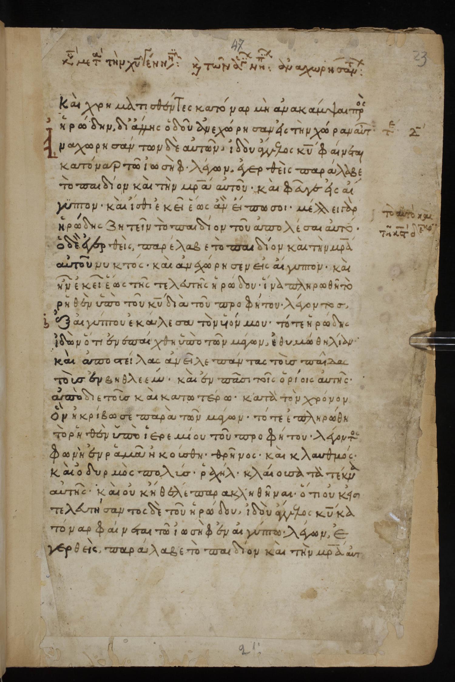 Thirteenth century minuscule of the Gospels, Apostolos, Paul, and Revelation on paper; 412 leaves, 1 column, 24-28 lines per column. Images were taken at the National Library of Greece in Athens.