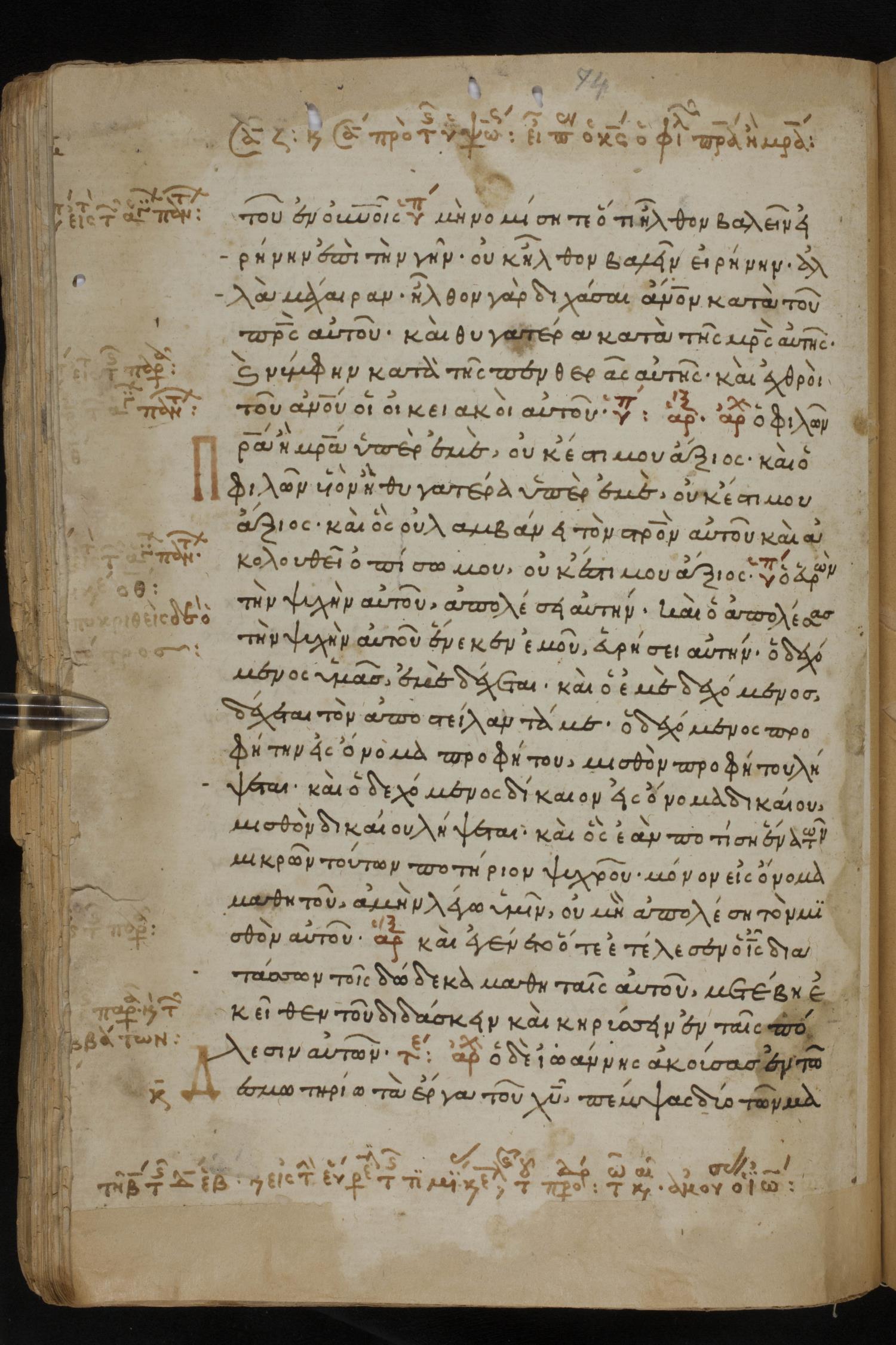 Thirteenth century minuscule of the Gospels, Apostolos, Paul, and Revelation on paper; 412 leaves, 1 column, 24-28 lines per column. Images were taken at the National Library of Greece in Athens.