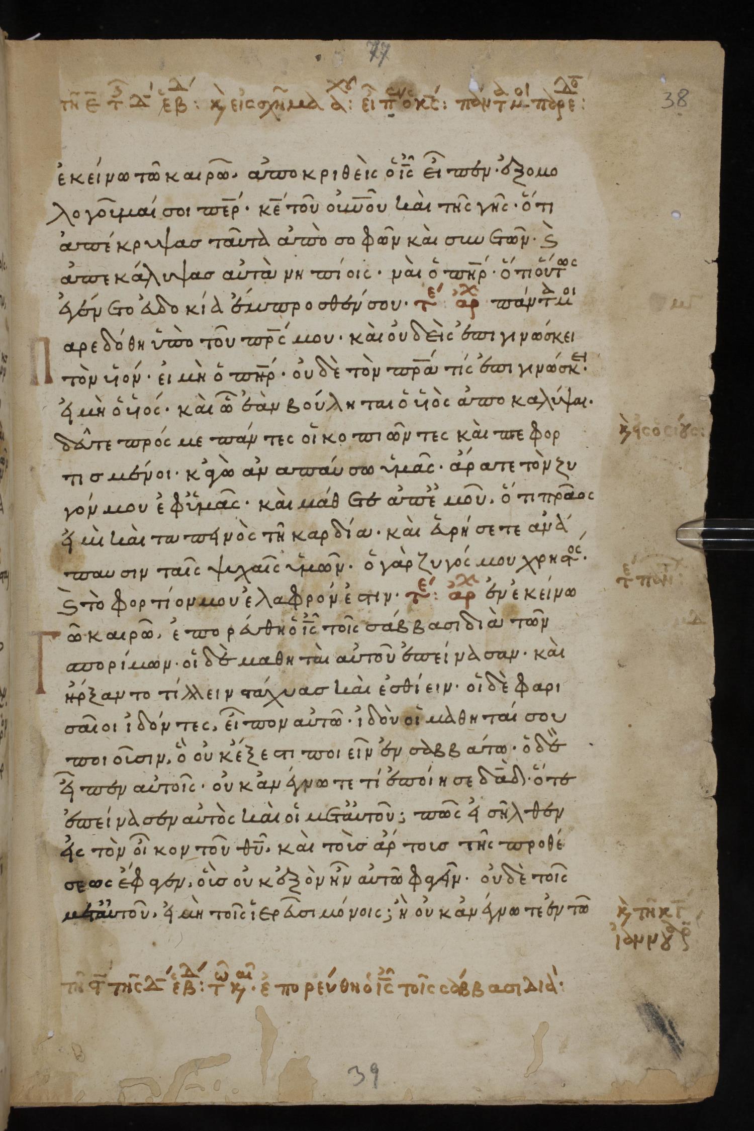 Thirteenth century minuscule of the Gospels, Apostolos, Paul, and Revelation on paper; 412 leaves, 1 column, 24-28 lines per column. Images were taken at the National Library of Greece in Athens.