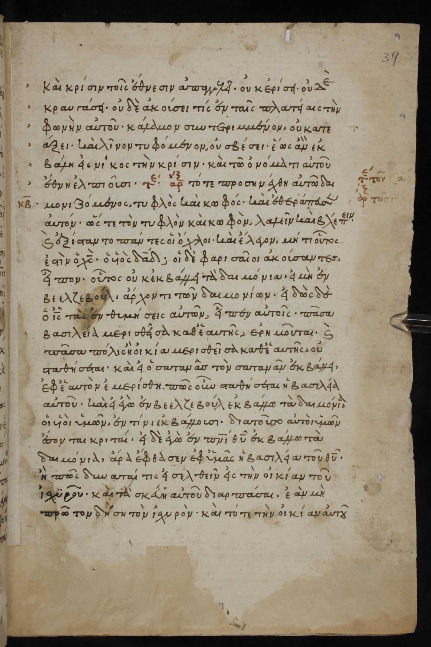 οἱ δὲ Φαρισαῖοι ἀκούσαντες εἶπον Οὗτος οὐκ ἐκβάλλει τὰ δαιμόνια εἰ μὴ ἐν τῷ Βεεζεβοὺλ / Βεελζεβοὺλ ἄρχοντι τῶν δαιμονίων.