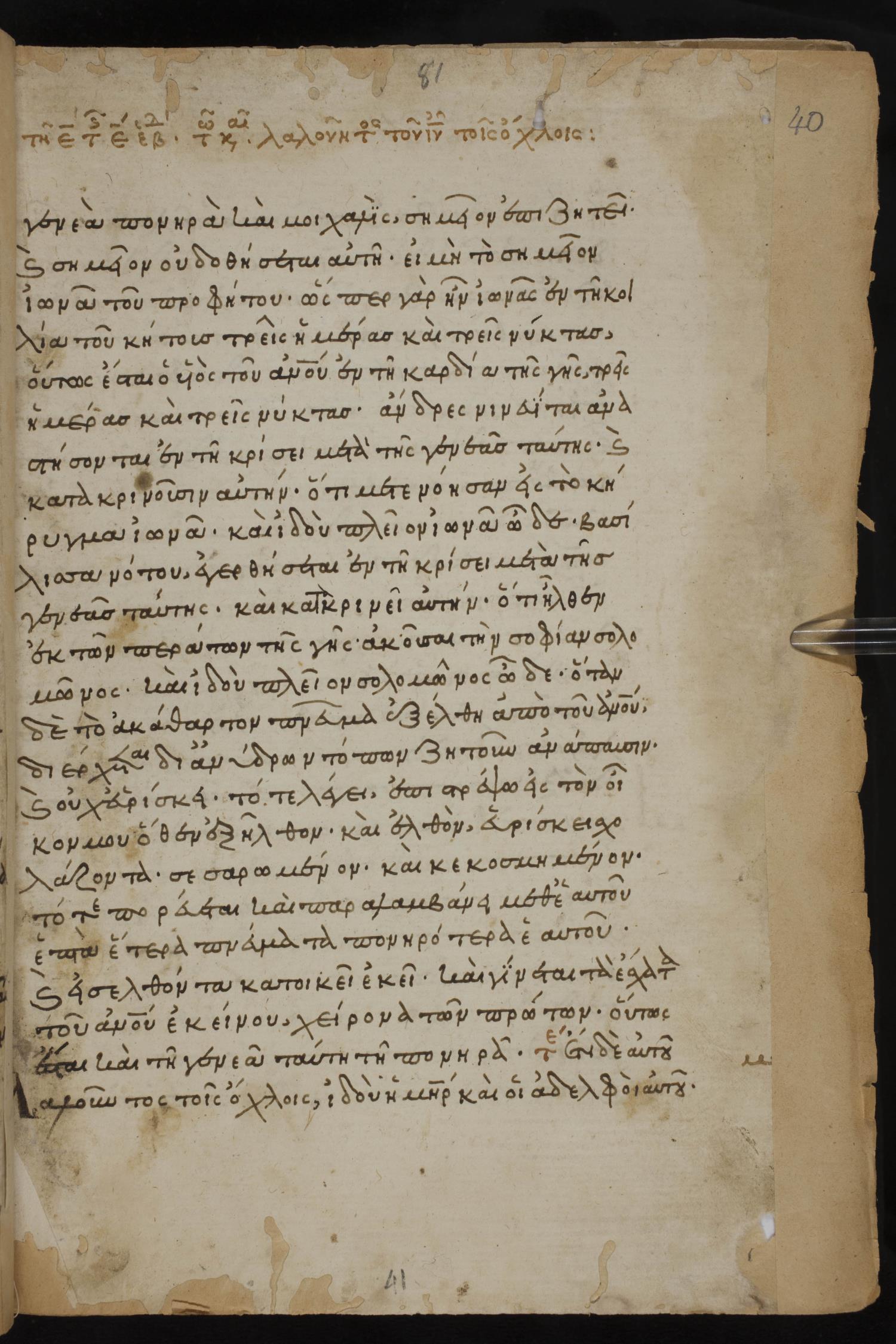 Thirteenth century minuscule of the Gospels, Apostolos, Paul, and Revelation on paper; 412 leaves, 1 column, 24-28 lines per column. Images were taken at the National Library of Greece in Athens.