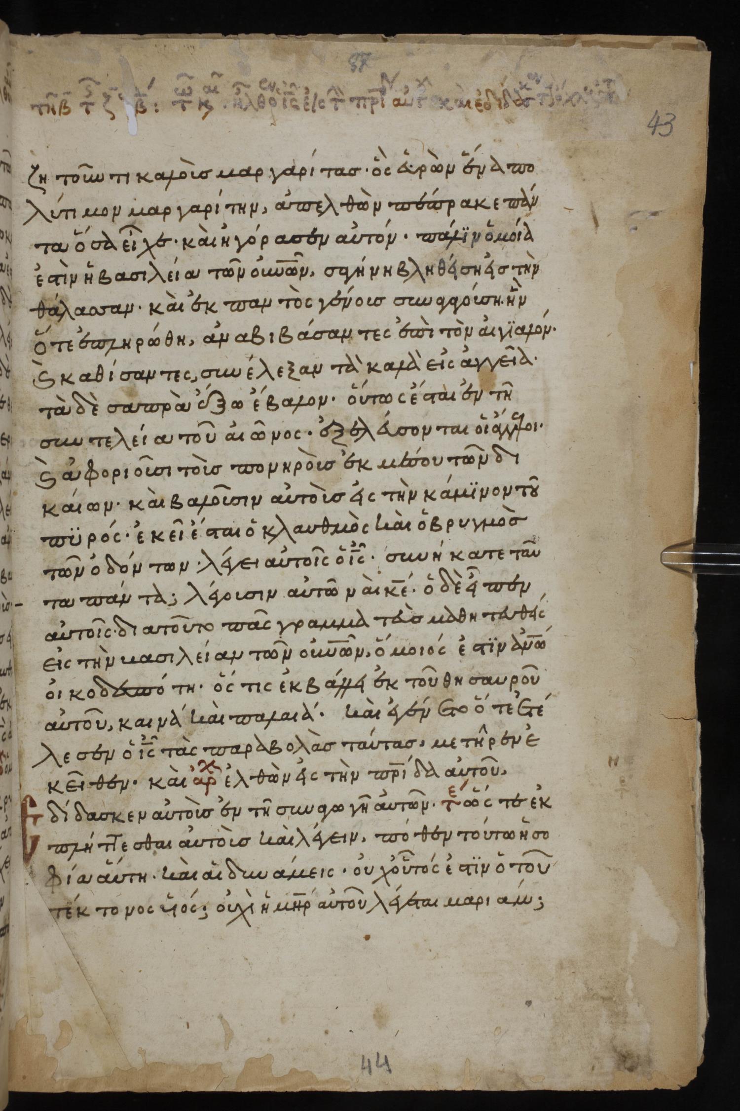 Thirteenth century minuscule of the Gospels, Apostolos, Paul, and Revelation on paper; 412 leaves, 1 column, 24-28 lines per column. Images were taken at the National Library of Greece in Athens.