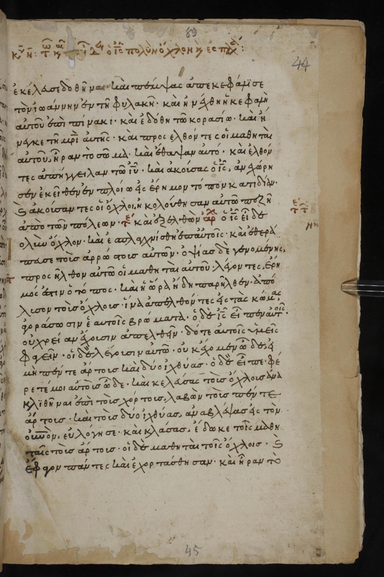 Thirteenth century minuscule of the Gospels, Apostolos, Paul, and Revelation on paper; 412 leaves, 1 column, 24-28 lines per column. Images were taken at the National Library of Greece in Athens.