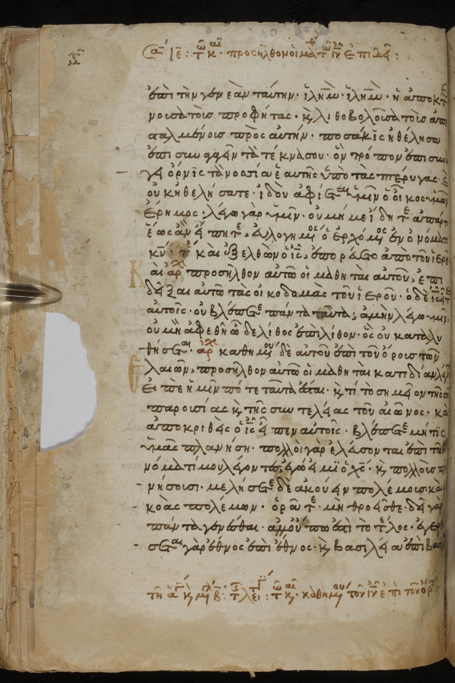 Thirteenth century minuscule of the Gospels, Apostolos, Paul, and Revelation on paper; 412 leaves, 1 column, 24-28 lines per column. Images were taken at the National Library of Greece in Athens.