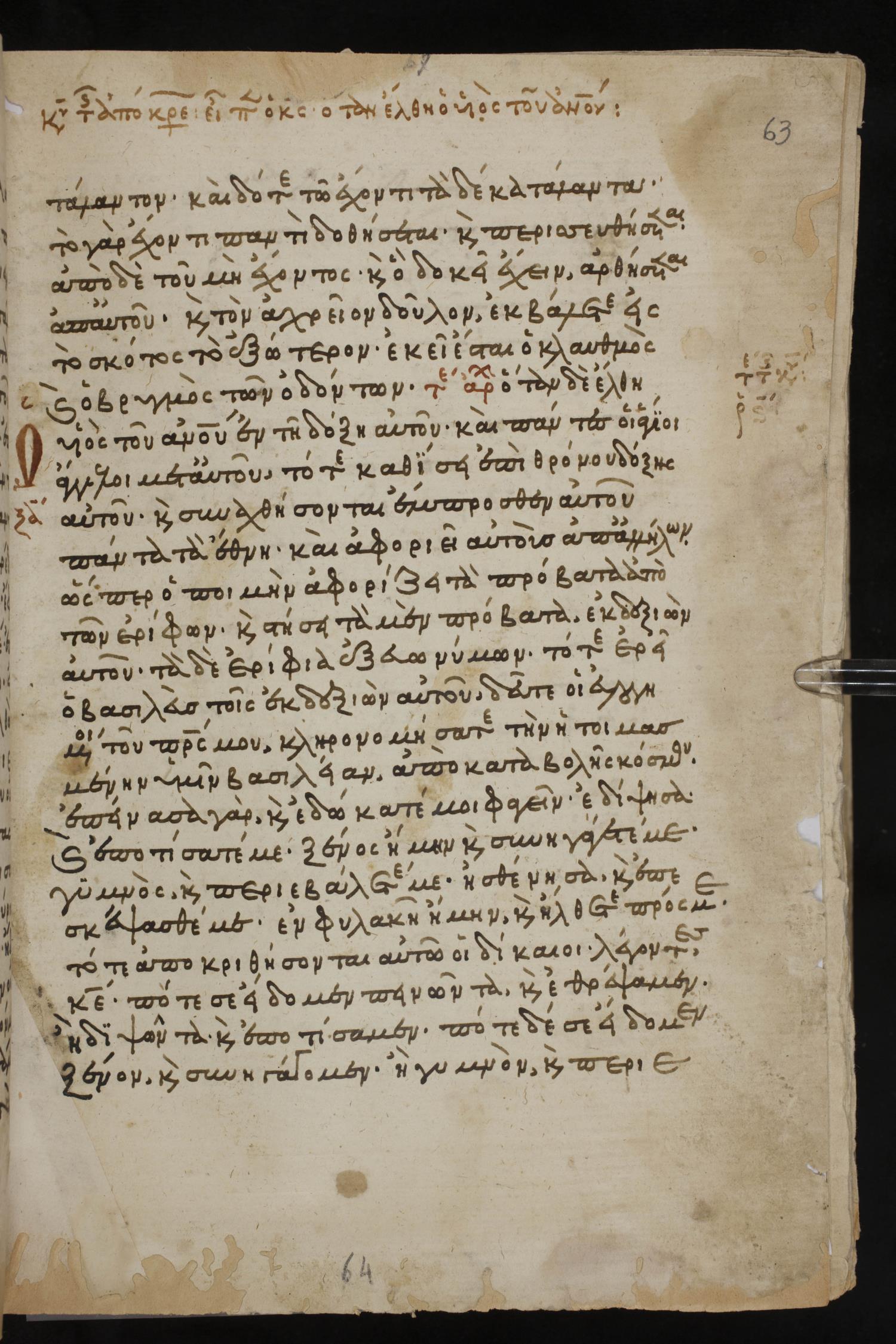 Thirteenth century minuscule of the Gospels, Apostolos, Paul, and Revelation on paper; 412 leaves, 1 column, 24-28 lines per column. Images were taken at the National Library of Greece in Athens.