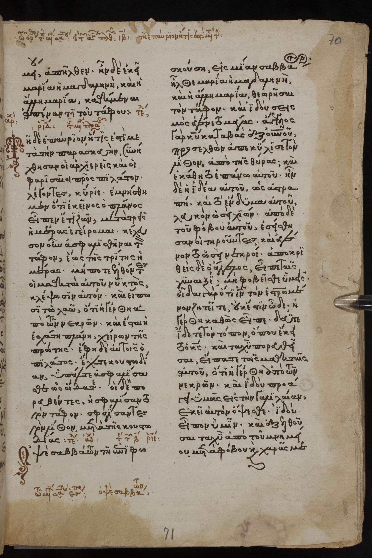 Thirteenth century minuscule of the Gospels, Apostolos, Paul, and Revelation on paper; 412 leaves, 1 column, 24-28 lines per column. Images were taken at the National Library of Greece in Athens.
