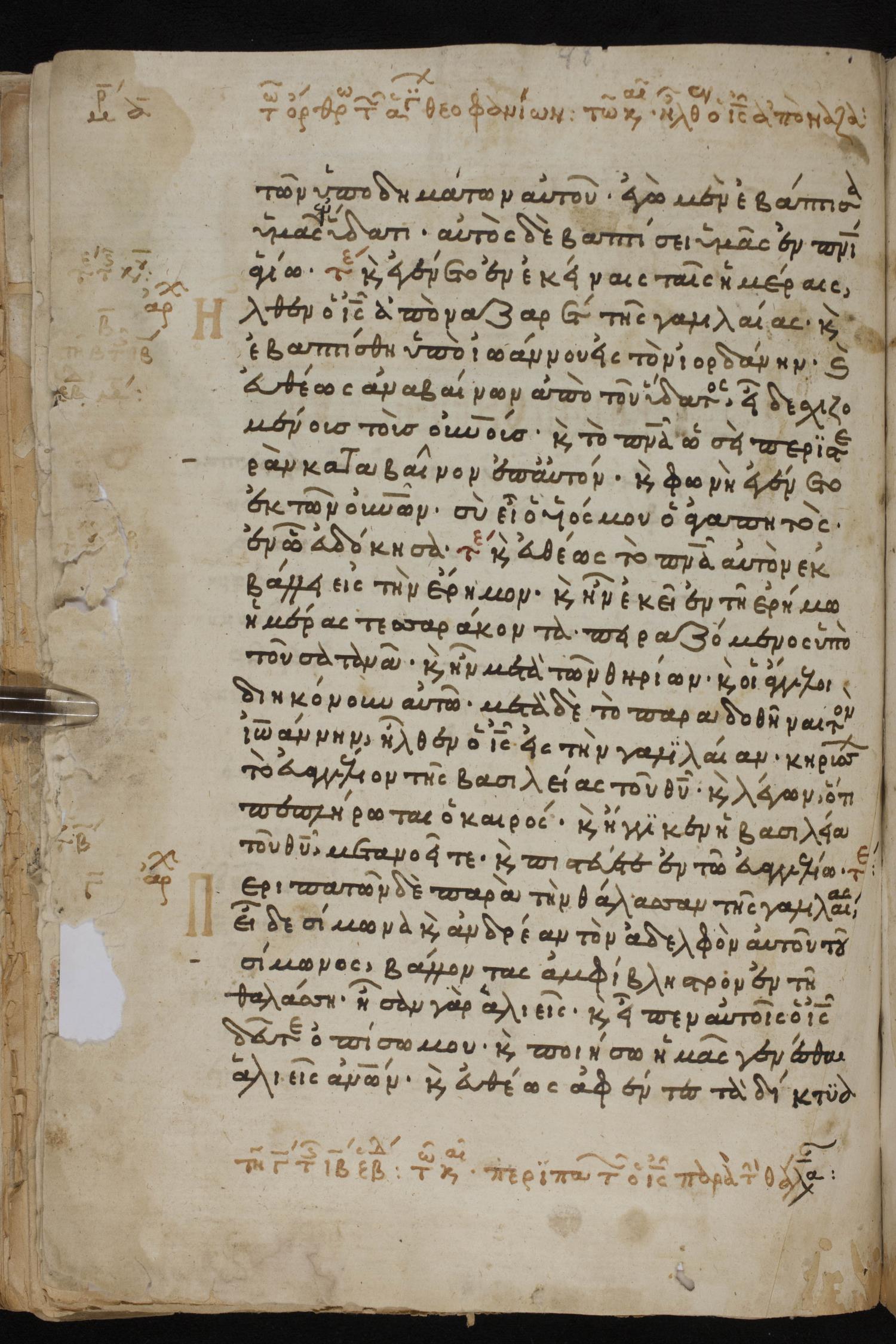 Thirteenth century minuscule of the Gospels, Apostolos, Paul, and Revelation on paper; 412 leaves, 1 column, 24-28 lines per column. Images were taken at the National Library of Greece in Athens.