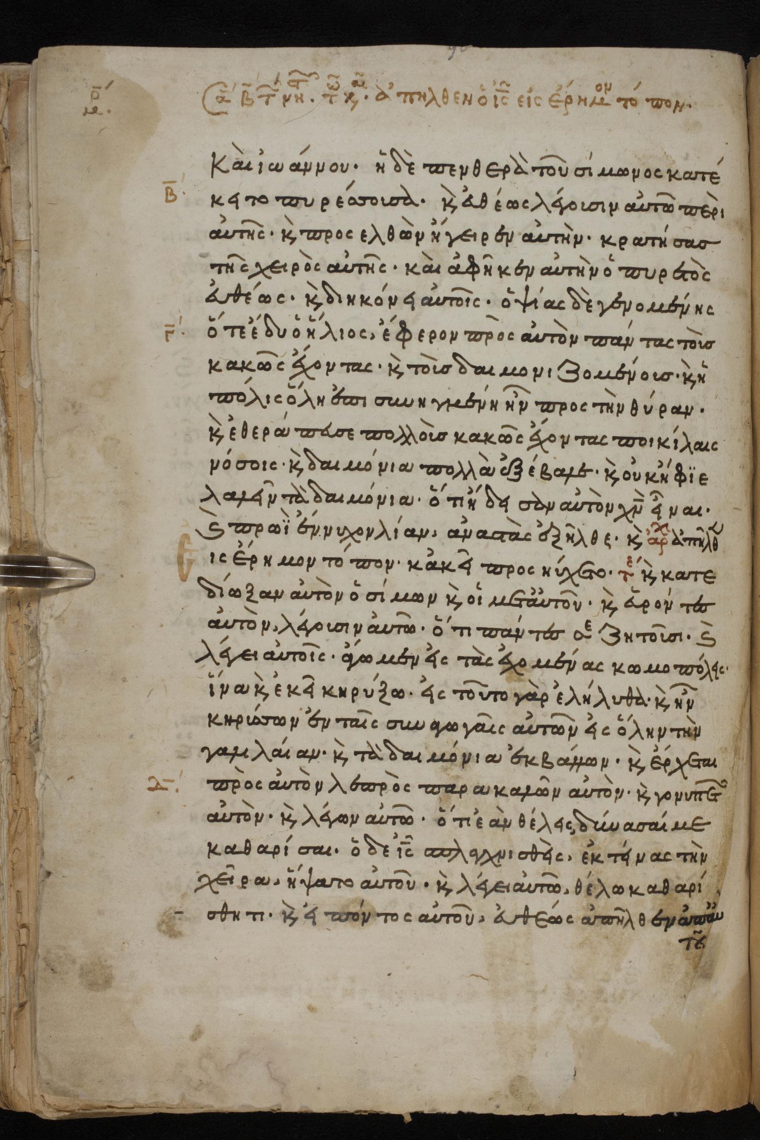 Thirteenth century minuscule of the Gospels, Apostolos, Paul, and Revelation on paper; 412 leaves, 1 column, 24-28 lines per column. Images were taken at the National Library of Greece in Athens.