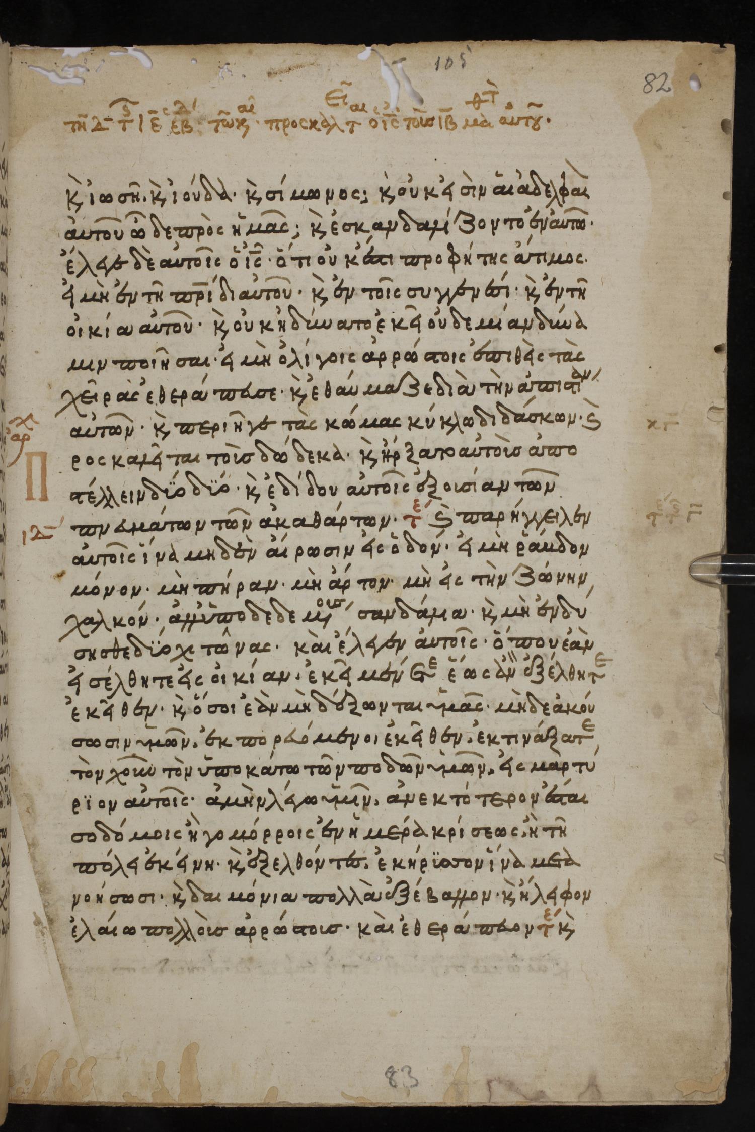 Thirteenth century minuscule of the Gospels, Apostolos, Paul, and Revelation on paper; 412 leaves, 1 column, 24-28 lines per column. Images were taken at the National Library of Greece in Athens.