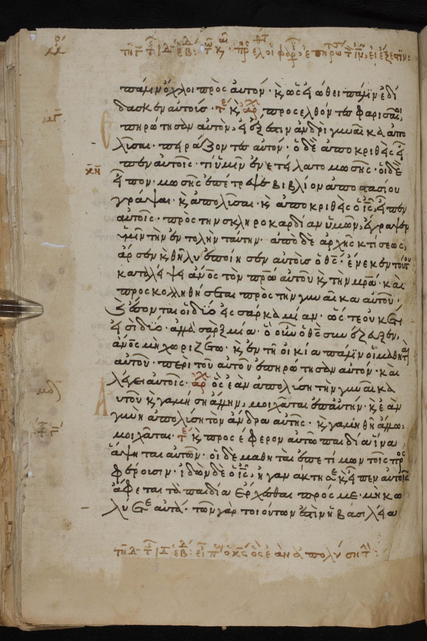 Thirteenth century minuscule of the Gospels, Apostolos, Paul, and Revelation on paper; 412 leaves, 1 column, 24-28 lines per column. Images were taken at the National Library of Greece in Athens.