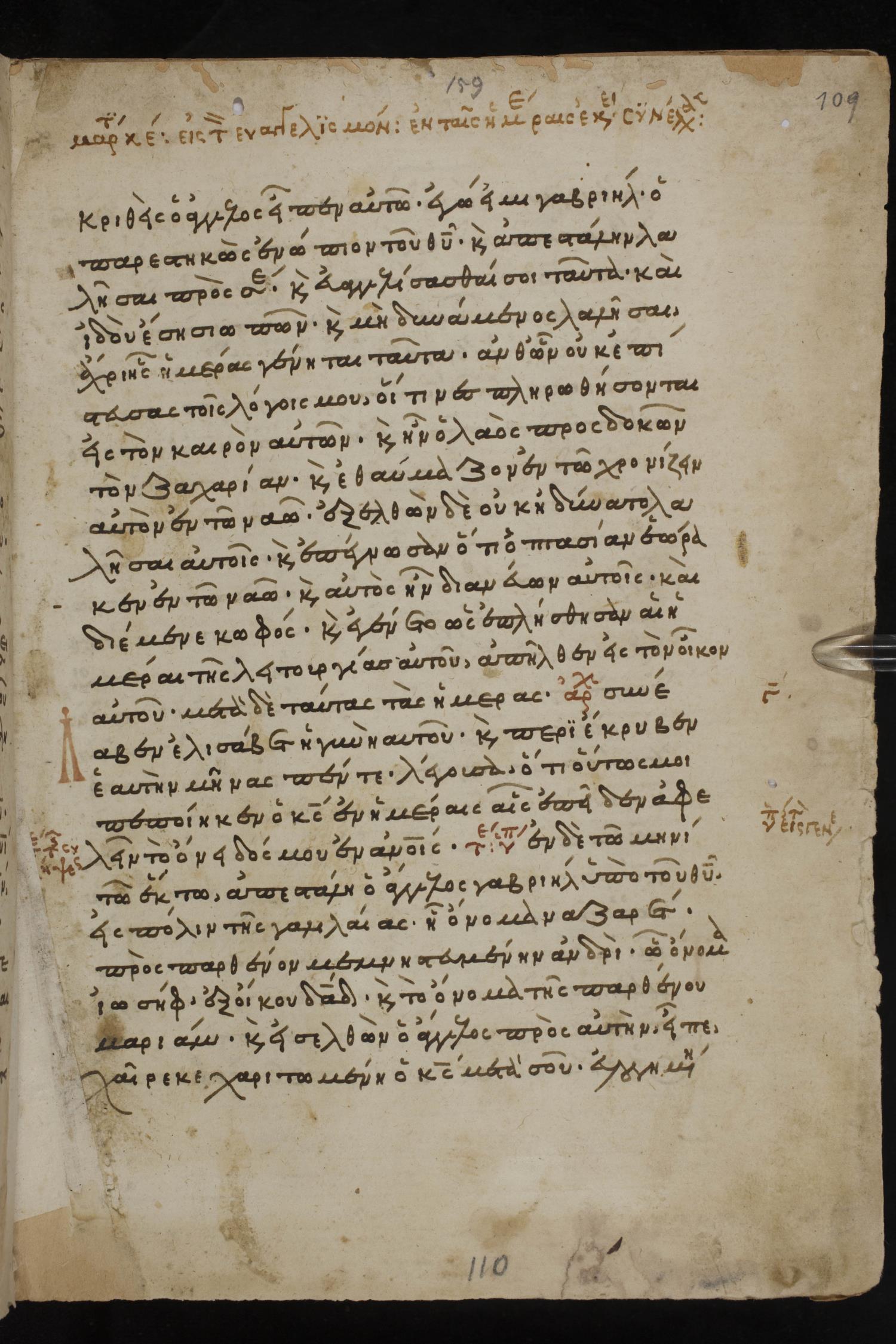Thirteenth century minuscule of the Gospels, Apostolos, Paul, and Revelation on paper; 412 leaves, 1 column, 24-28 lines per column. Images were taken at the National Library of Greece in Athens.