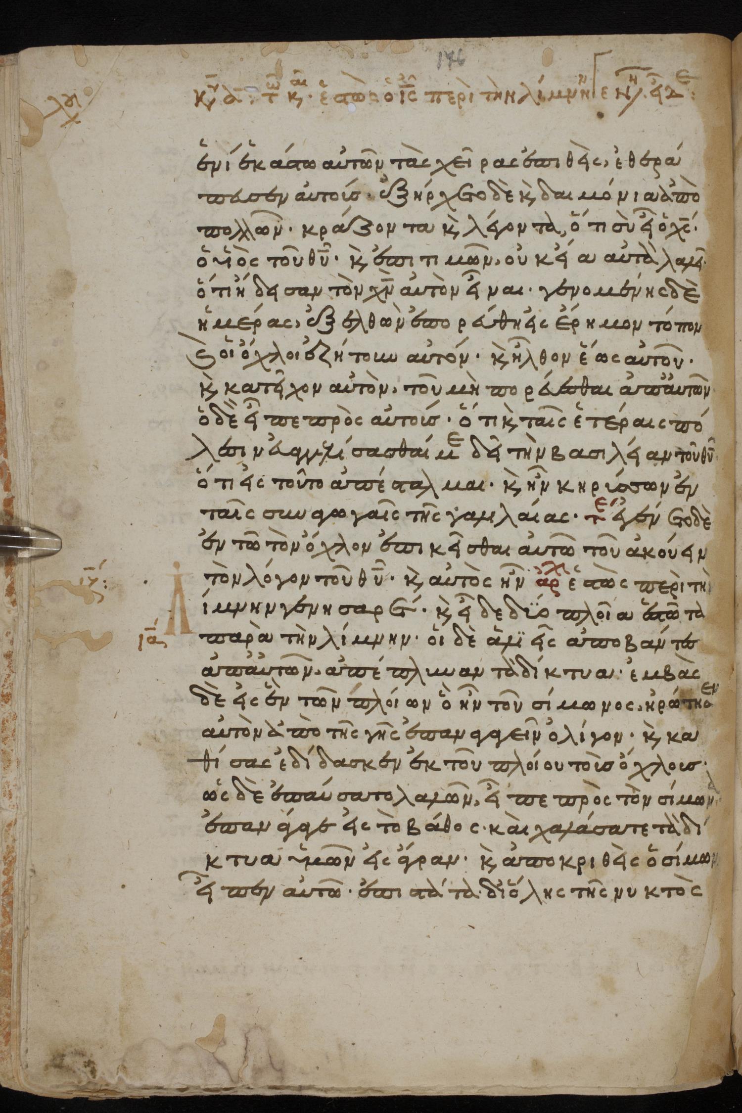 Thirteenth century minuscule of the Gospels, Apostolos, Paul, and Revelation on paper; 412 leaves, 1 column, 24-28 lines per column. Images were taken at the National Library of Greece in Athens.