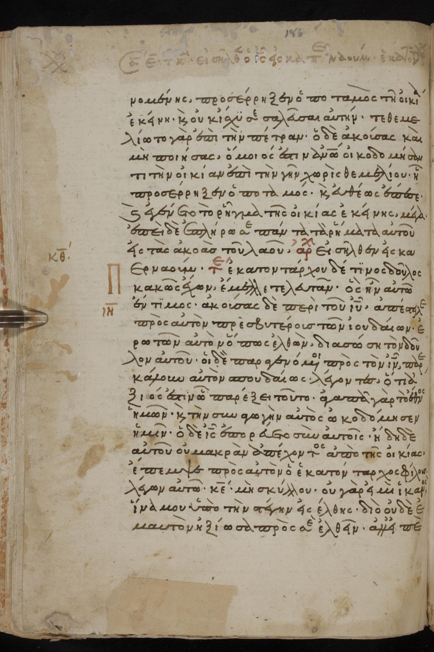 Thirteenth century minuscule of the Gospels, Apostolos, Paul, and Revelation on paper; 412 leaves, 1 column, 24-28 lines per column. Images were taken at the National Library of Greece in Athens.