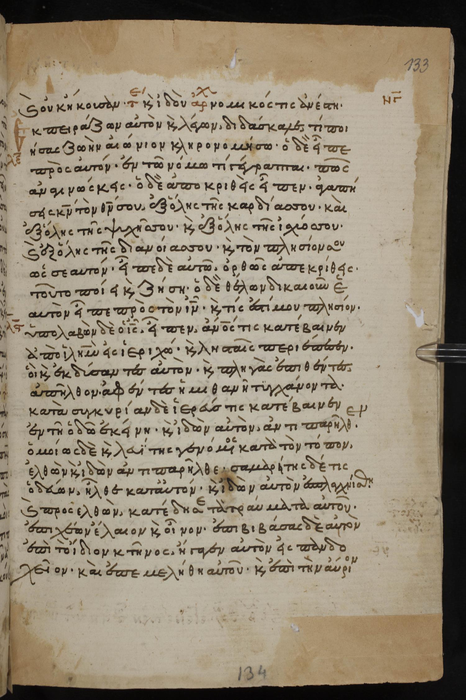 Thirteenth century minuscule of the Gospels, Apostolos, Paul, and Revelation on paper; 412 leaves, 1 column, 24-28 lines per column. Images were taken at the National Library of Greece in Athens.