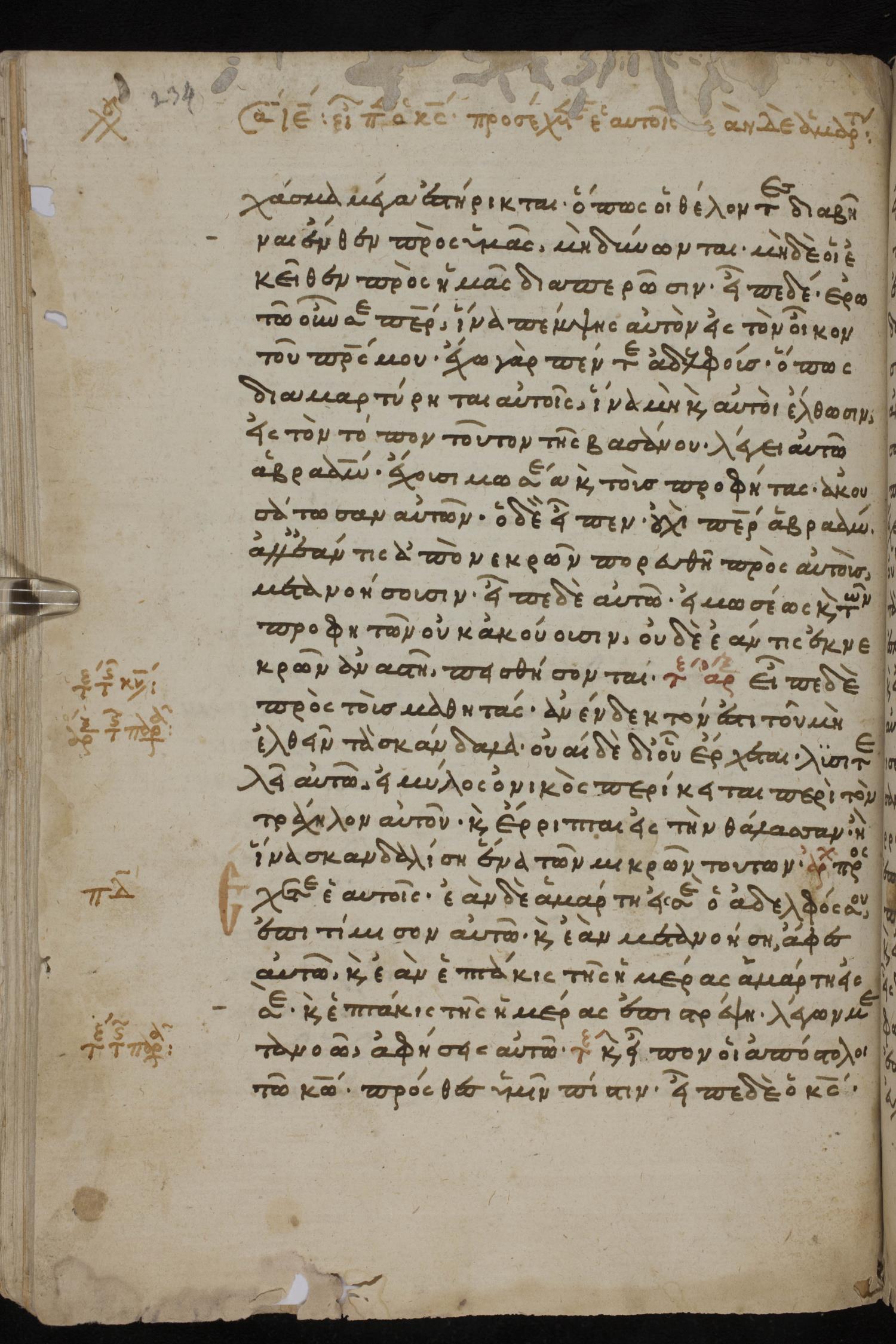 Thirteenth century minuscule of the Gospels, Apostolos, Paul, and Revelation on paper; 412 leaves, 1 column, 24-28 lines per column. Images were taken at the National Library of Greece in Athens.