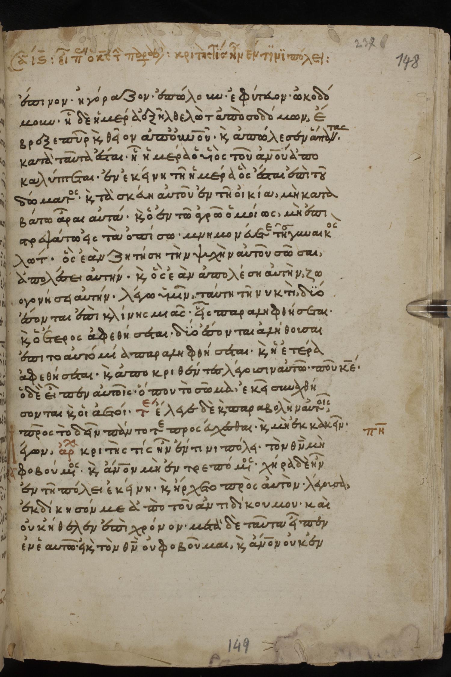 Thirteenth century minuscule of the Gospels, Apostolos, Paul, and Revelation on paper; 412 leaves, 1 column, 24-28 lines per column. Images were taken at the National Library of Greece in Athens.
