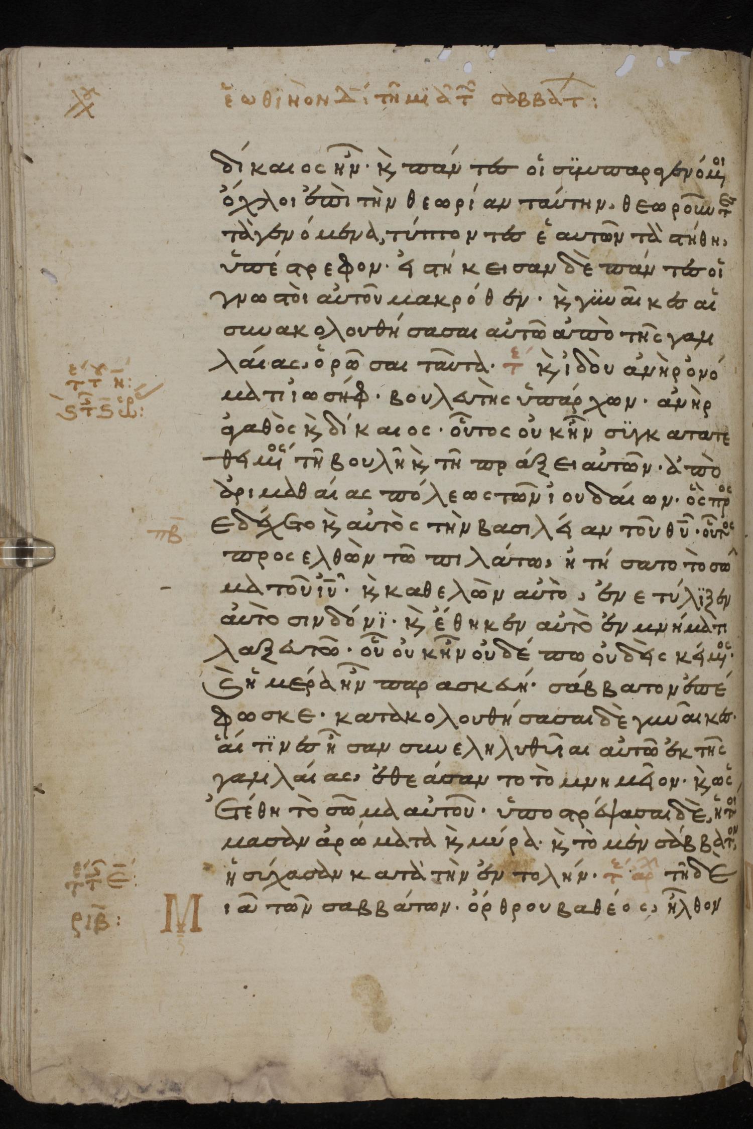 Thirteenth century minuscule of the Gospels, Apostolos, Paul, and Revelation on paper; 412 leaves, 1 column, 24-28 lines per column. Images were taken at the National Library of Greece in Athens.