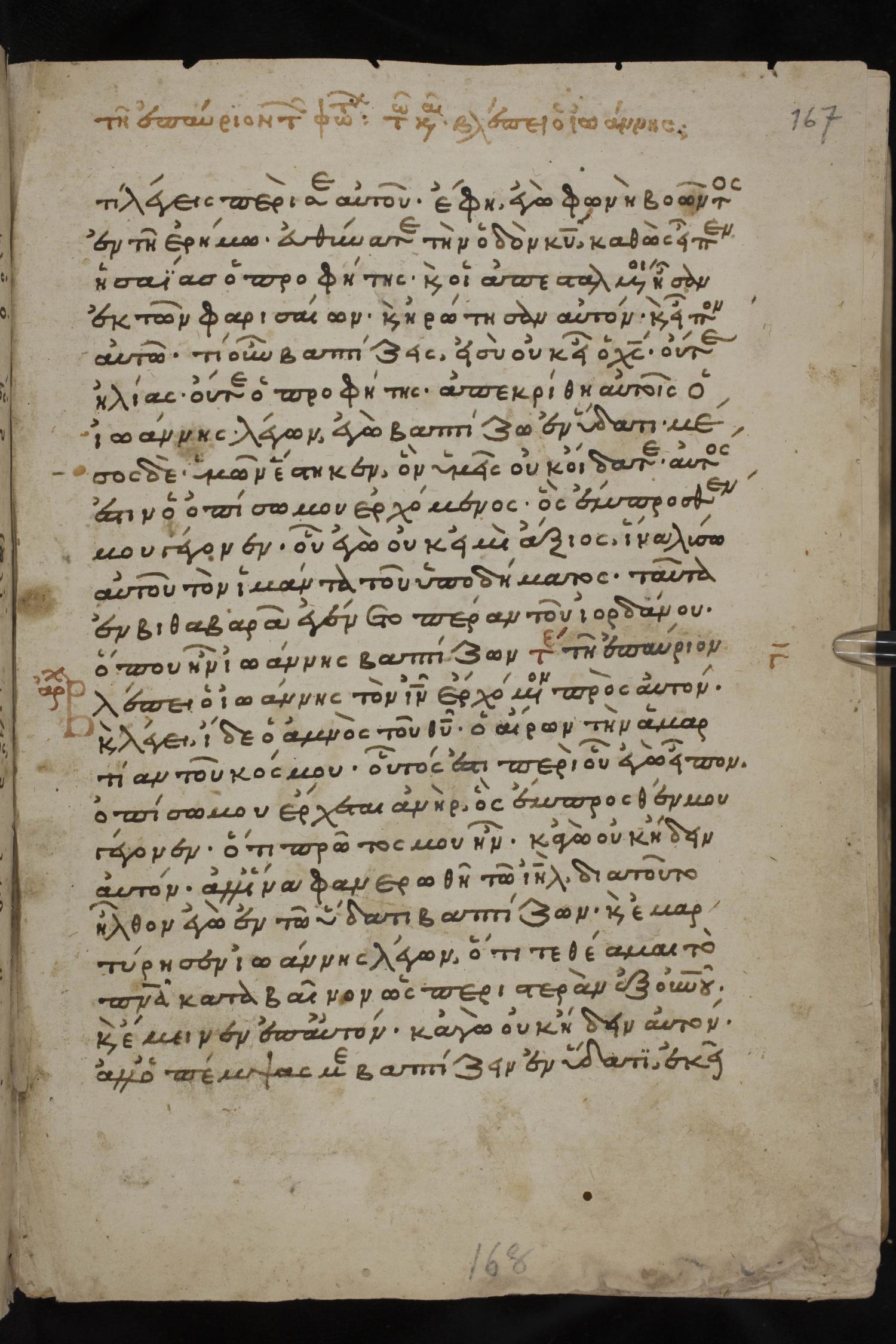 Thirteenth century minuscule of the Gospels, Apostolos, Paul, and Revelation on paper; 412 leaves, 1 column, 24-28 lines per column. Images were taken at the National Library of Greece in Athens.