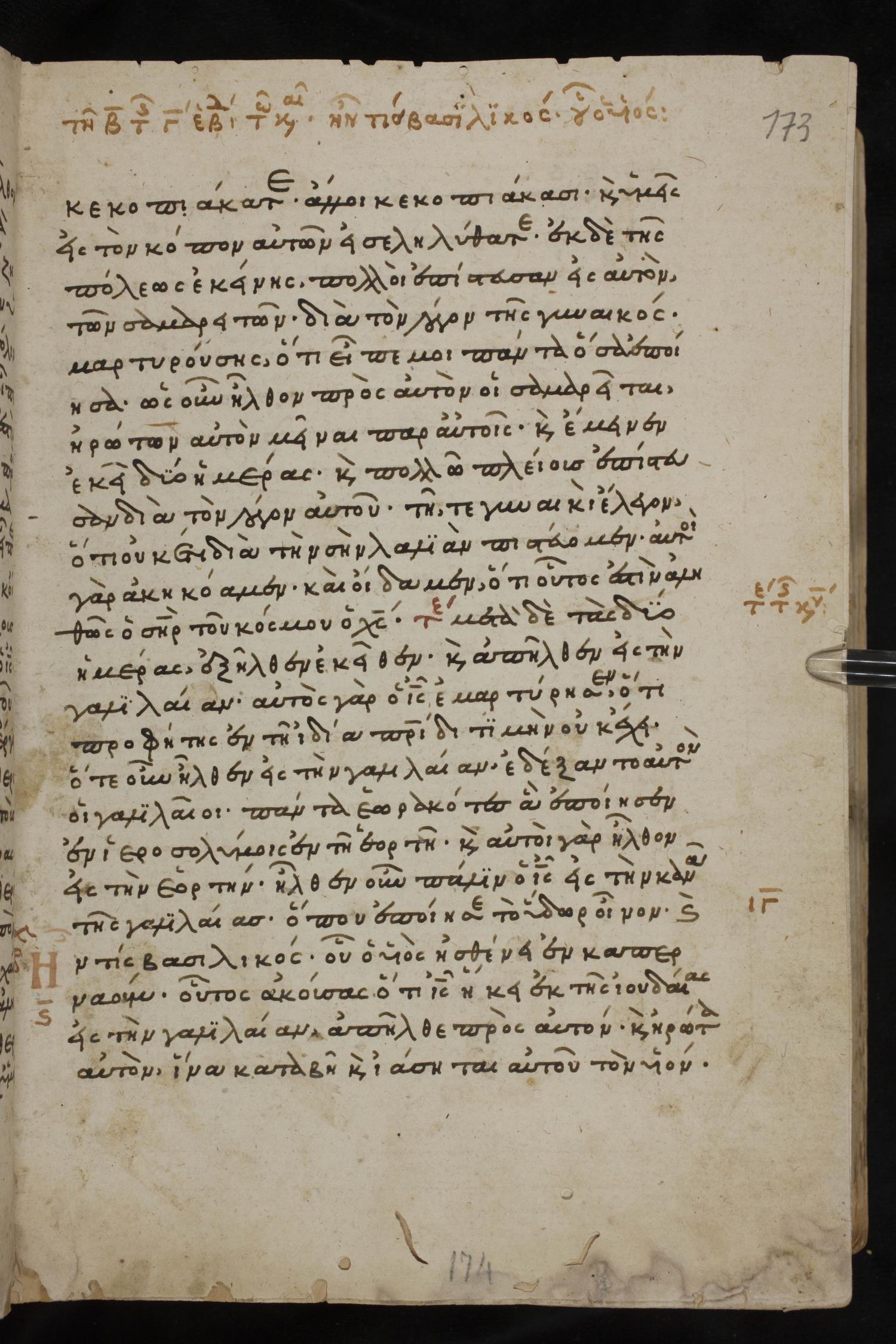 Thirteenth century minuscule of the Gospels, Apostolos, Paul, and Revelation on paper; 412 leaves, 1 column, 24-28 lines per column. Images were taken at the National Library of Greece in Athens.