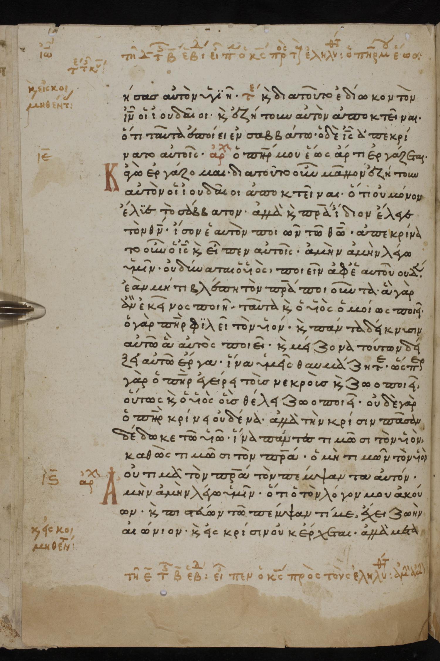 Thirteenth century minuscule of the Gospels, Apostolos, Paul, and Revelation on paper; 412 leaves, 1 column, 24-28 lines per column. Images were taken at the National Library of Greece in Athens.