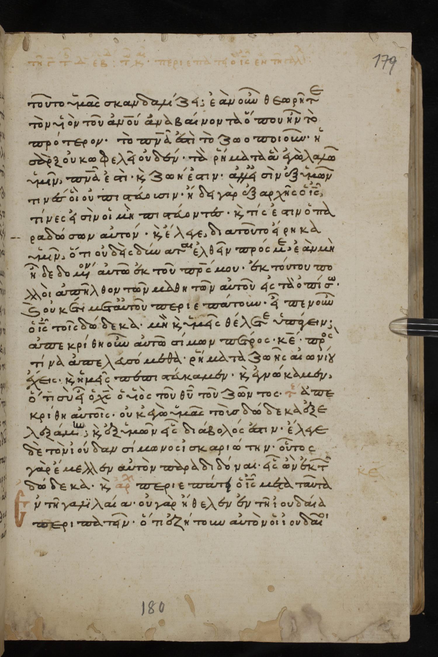 Thirteenth century minuscule of the Gospels, Apostolos, Paul, and Revelation on paper; 412 leaves, 1 column, 24-28 lines per column. Images were taken at the National Library of Greece in Athens.